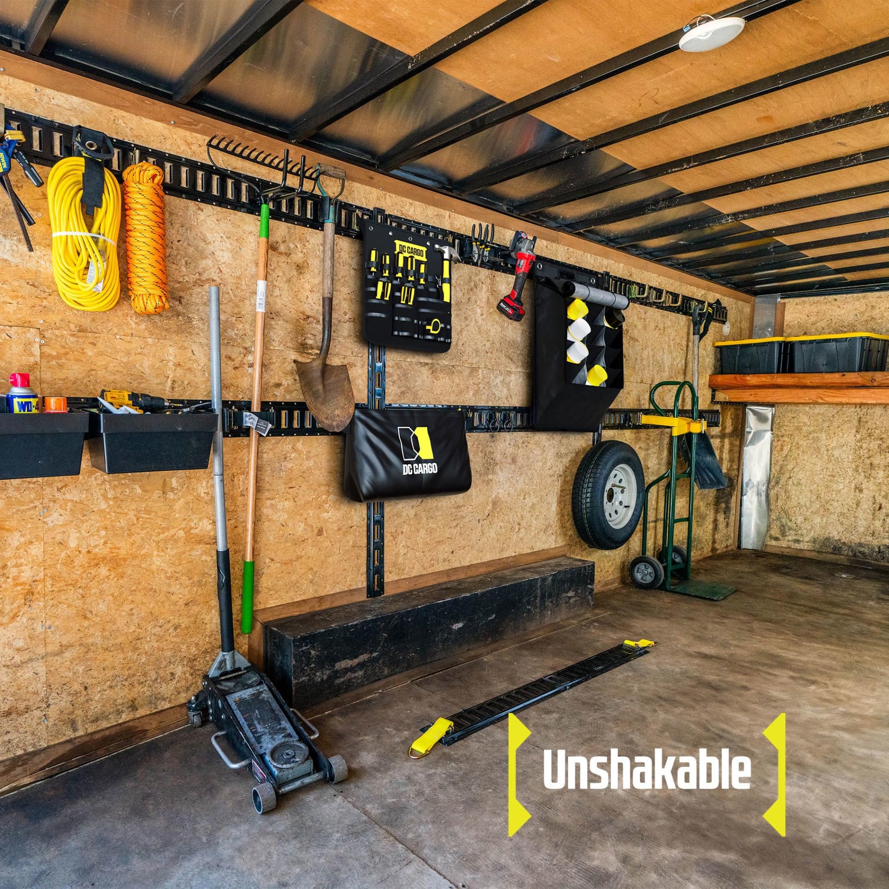 - ✔ NEW AND IMPROVED (ETrack NOT included): This portable, lightweight 14” high x 24” wide wall-hanging storage bag is made out of heavy duty black vinyl material with a DC Cargo Mall logo on it, and can sustain a work load limit of 50 pounds. Heavy duty reinforced stitching on the tabs ensures this pouch is durable and resilient for longtime use in trucks, trailers, docks, warehouses, garages and work stations.