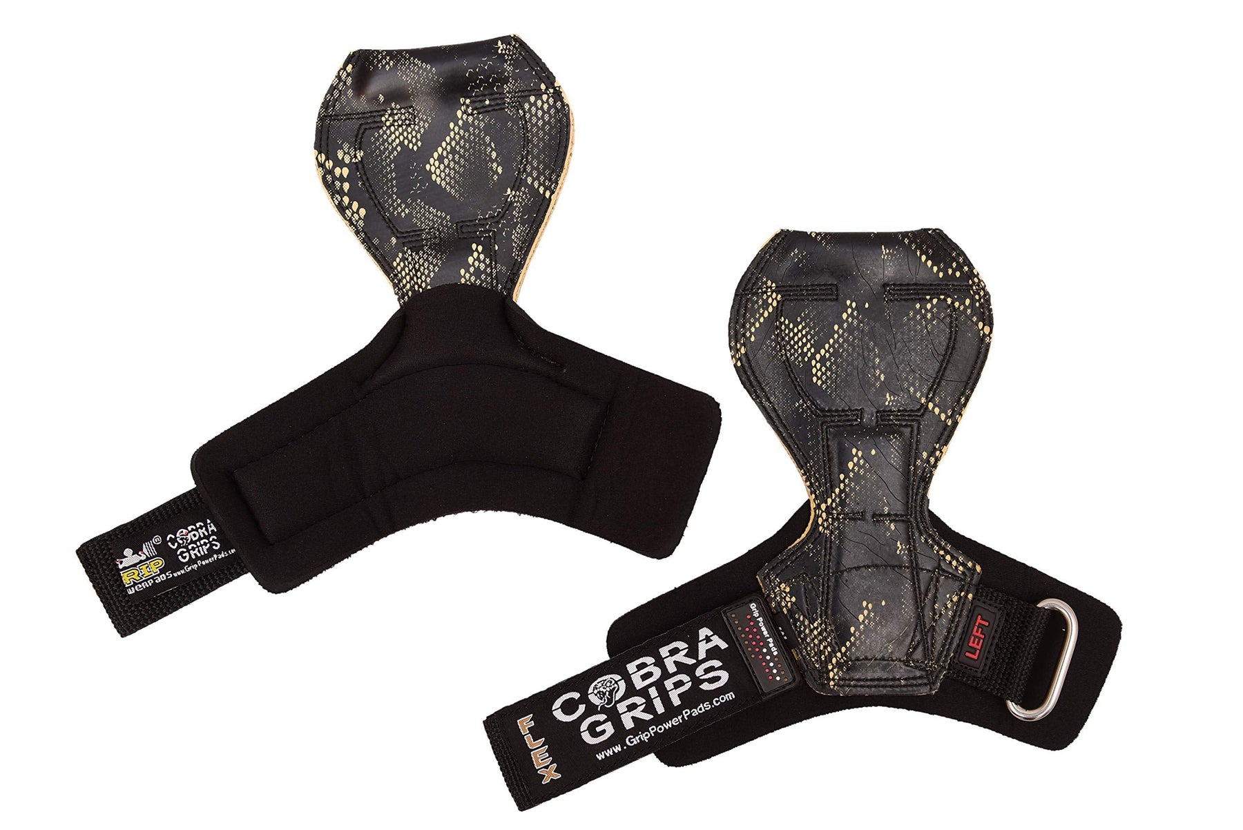 Details: This listing for our New Cobra Grips 2018 FLEX Model PATENT number USD804589S1 that comes in three different sizes for men & women. Lifting grips, lifting straps and power hooks are designed to make your workout safer and more comfortable, but most products just complicate your workouts. Many just aren't thick enough to function well as a grip pad, leaving you with chaffing despite having used protection. Others may be thick but feature awkward wrist wraps and have ill fitting designs that are a different kind of pain! Plus, having to carry grips, straps and hooks in your gym bag is a hassle you just don't need. Fortunately, there is a way to get the protection you need without compromising your performance of over stuffing your gym bag. Lifting Grips by Grip Power Pads are the solution Lifting Grips by Grip Power Pads are unlike any other gym gloves alternative on the market today and are so advanced that we're patenting their exclusive technology. With this single fitness accessory, you get a grip pad pair to protect your hands from chaffing, lifting straps for improving your grip and power hooks to help you keep hold of the bar. Adjustable Wrist Straps. What you won't get is the hassles of having to adjust separate wrist wraps, as the wrist bands are built right into the Lifting Grips by Grip Power Pads for maximum comfort and convenience. Made from flexible neoprene, Lifting Grips by Grip Power Pads measure 6 millimeters in thickness, so they provide ample cushioning that can outperform many a grip pad sold on Amazon. The no-slip design keeps your hands perfectly positioned on the bar with none of the sliding you can experience with ordinary lifting straps. The ergonomic design ensures the safety of the fingers, hands and wrists, and the lifting grips are fully adjustable, so you'll never be held back by awkward gloves again. You can use Lifting Grips by Grip Power Pads for all types of pulling and pushing moves.