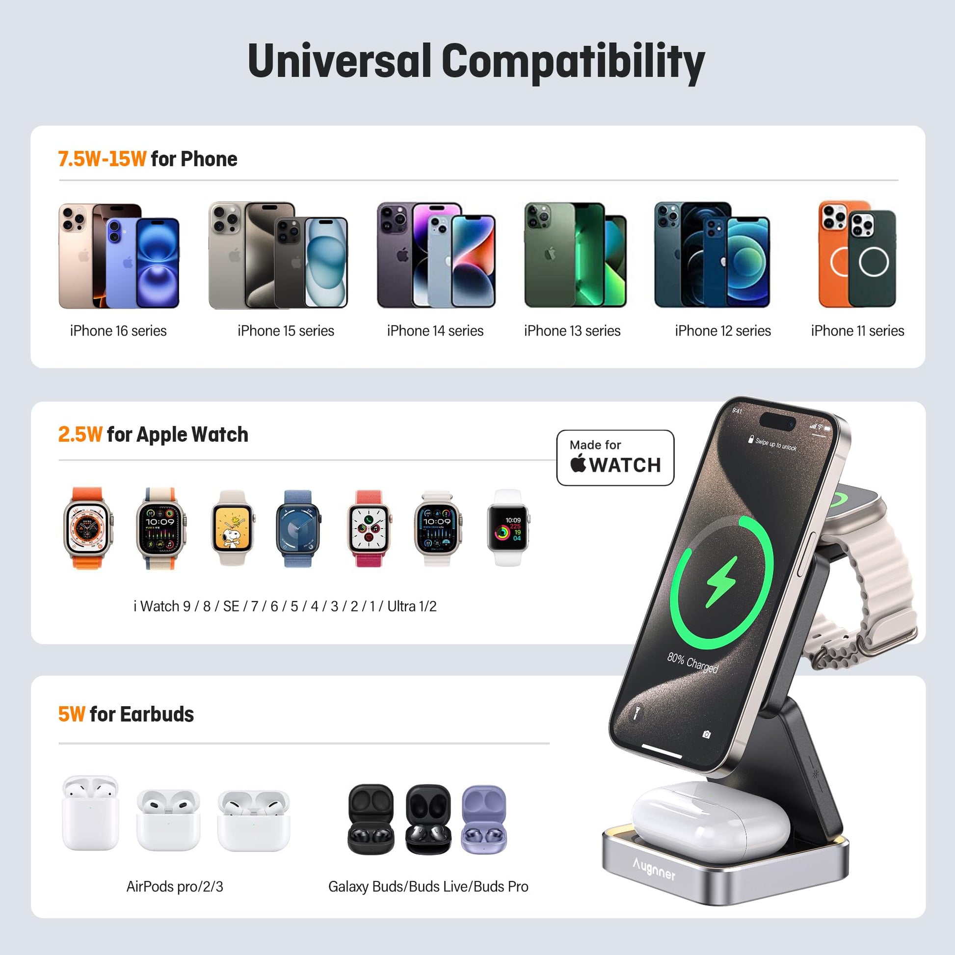 - Superior Safety-- Augnner wireless charging station is loaded with high - grade materials and smart chips. They work tirelessly to safeguard against overheating, pesky short circuits, and overcharging. So, you can power up your devices with complete peace of mind. It's compatible with the iPhone 16/15/14/13/12 series (and iPhone 8 - 11 compatible with a MagSafe case), all Apple Watch models, and AirPods Pro/3/2.