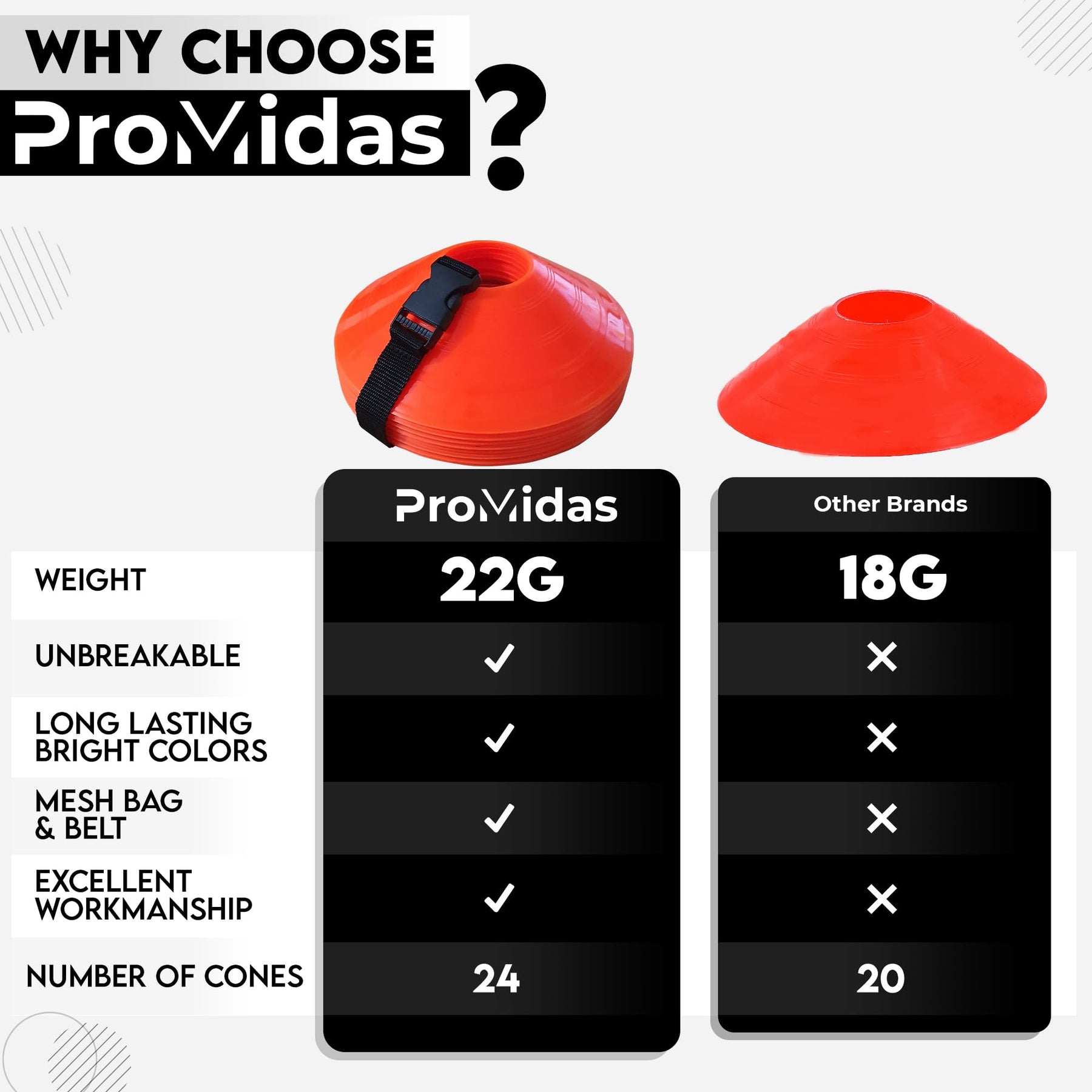 • ⚽Flexible Strength for Soccer Excellence: ProMidas sports cones for drills are built tough with high-quality PP material and weigh 22g, ensuring they withstand rough play and extreme weather without cracking or breaking, providing long-lasting performance