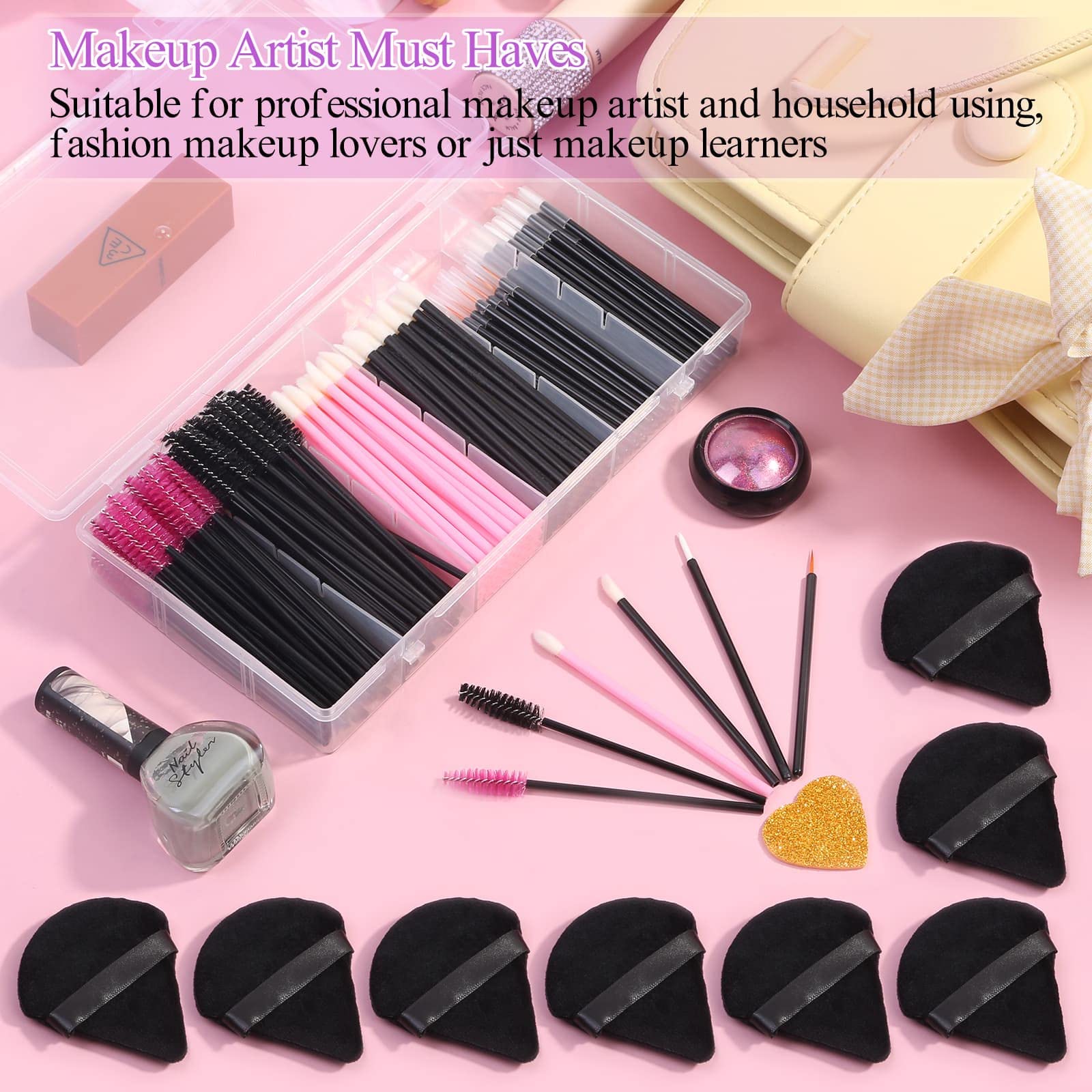 - 【Disposable Makeup Applicator Kit】 The disposable makeup tools kit includes 8 pcs triangle powder puffs, 100 pcs mascara wands, 100 pcs lip wands, 40 pcs eyelash liner brushes, and 1pcs clear organizer box, a total of 248 pieces, the makeup artist must haves makeup accessories are clean and safe for professional makeup artist, personal daily makeup, or clients to try samples of lipstick or mascara in cosmetic counter.