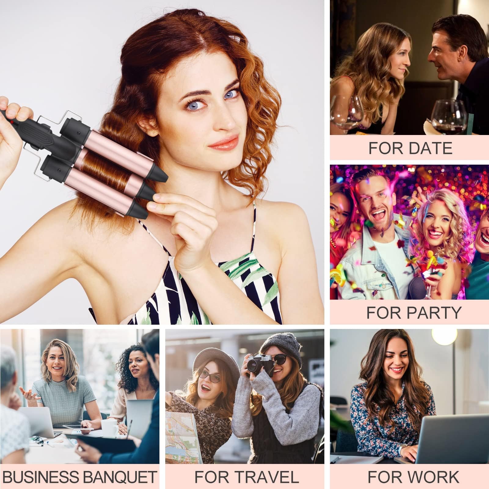 - 【Works on All Hair Types】Our hair crimpers is great for women shoulder length short hair, medium hair, preferably long hair, creating beachy look hairstyles. Unlike single barrel beach waver hair curler that take many times to curl,this three barrel hair waver finish in few minutes. Don't need to wait for a beach vacation to get this look. Making your hair looks silky,shiny and stylish.