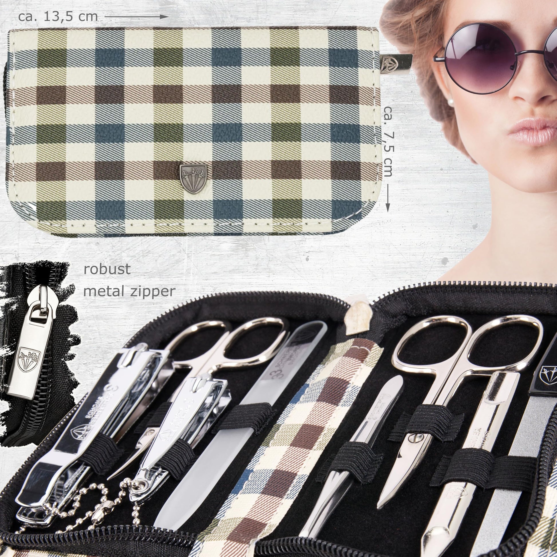 - CASE: Fashion leather chequered, size ca. 14,0 x 8,0 x 3,0 cm. Our organizers are made of high-grade fashion or classic materials. Additional equipment: Microfiber cleaning cloth for cleaning steel items, general info sheet “Finger - Nail Grooming”.