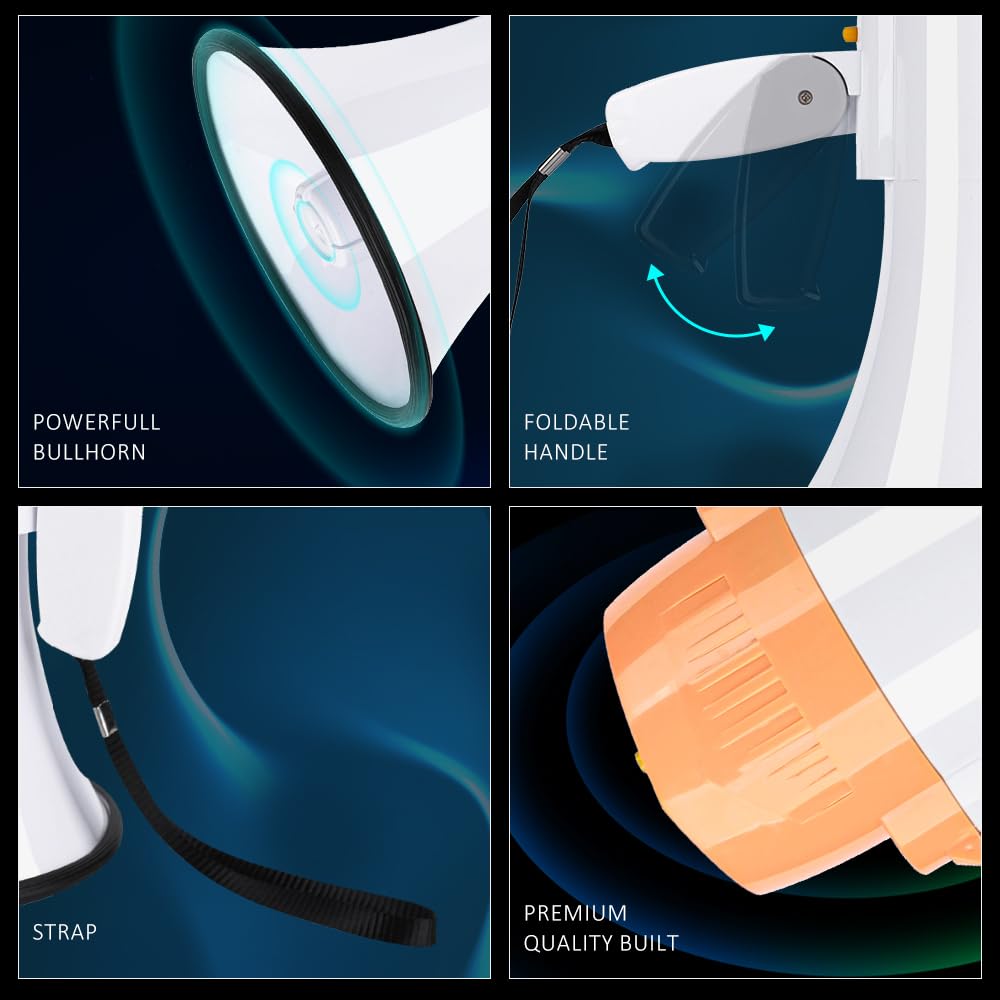 Details: Loudmore 30 Watt Power Portable Megaphone Bullhorn Speaker Voice, Siren/Alarm and 240S Recording with Volume Control and Strap (White Orange)