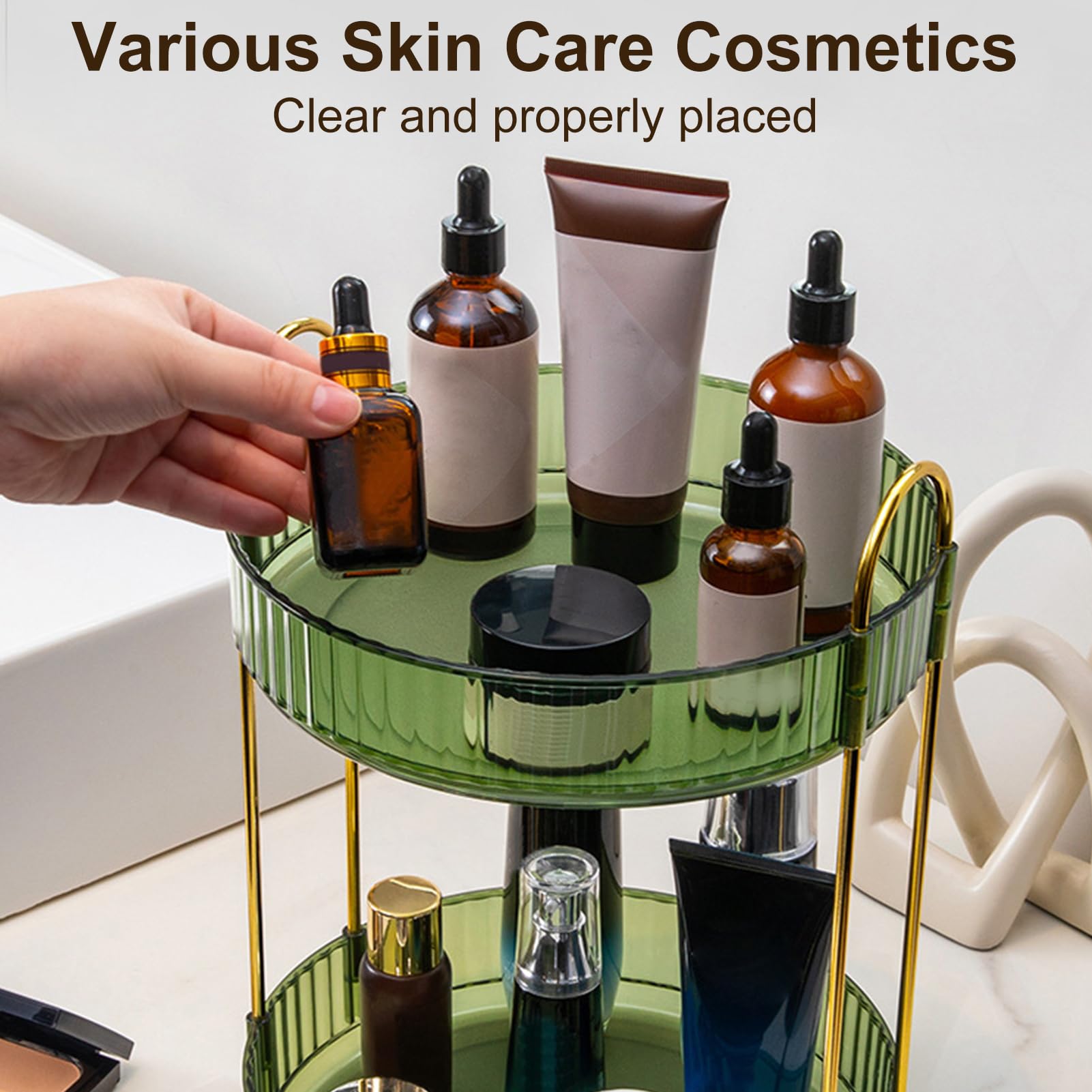 - 【360 Degree Rotating Design】 The skincare organiser is designed with a reinforced base that can be turned 360°smoothly and silently, allowing you to organize and find the cosmetics. And the edge on the tray is high enough to prevent makeup from falling during rotation.