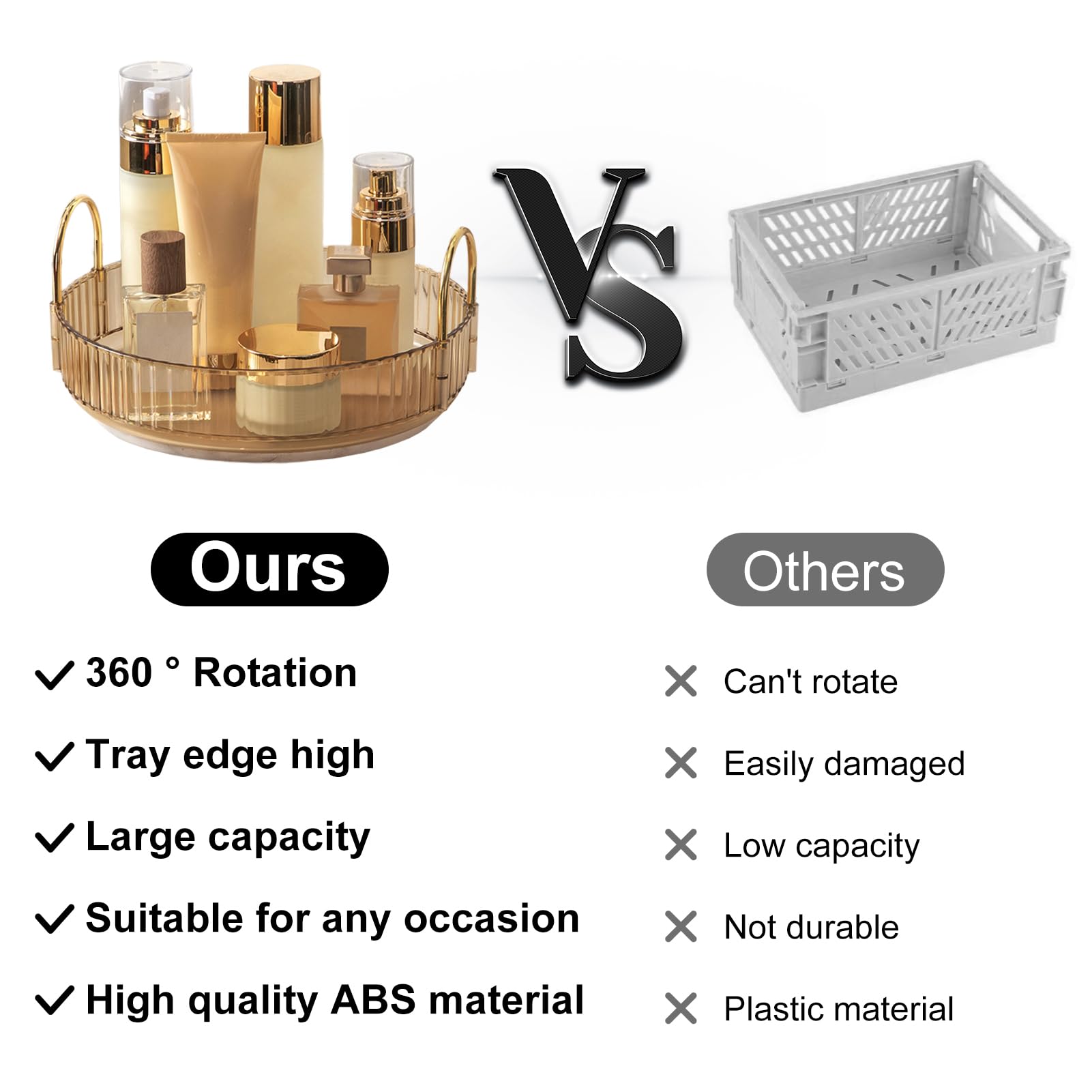 360-degree easy rotation can bring you a more convenient experience. The rotating base is smooth, and the tray edge is high enough to prevent cosmetics from falling when rotating. You can also use it as a fantastic present.
