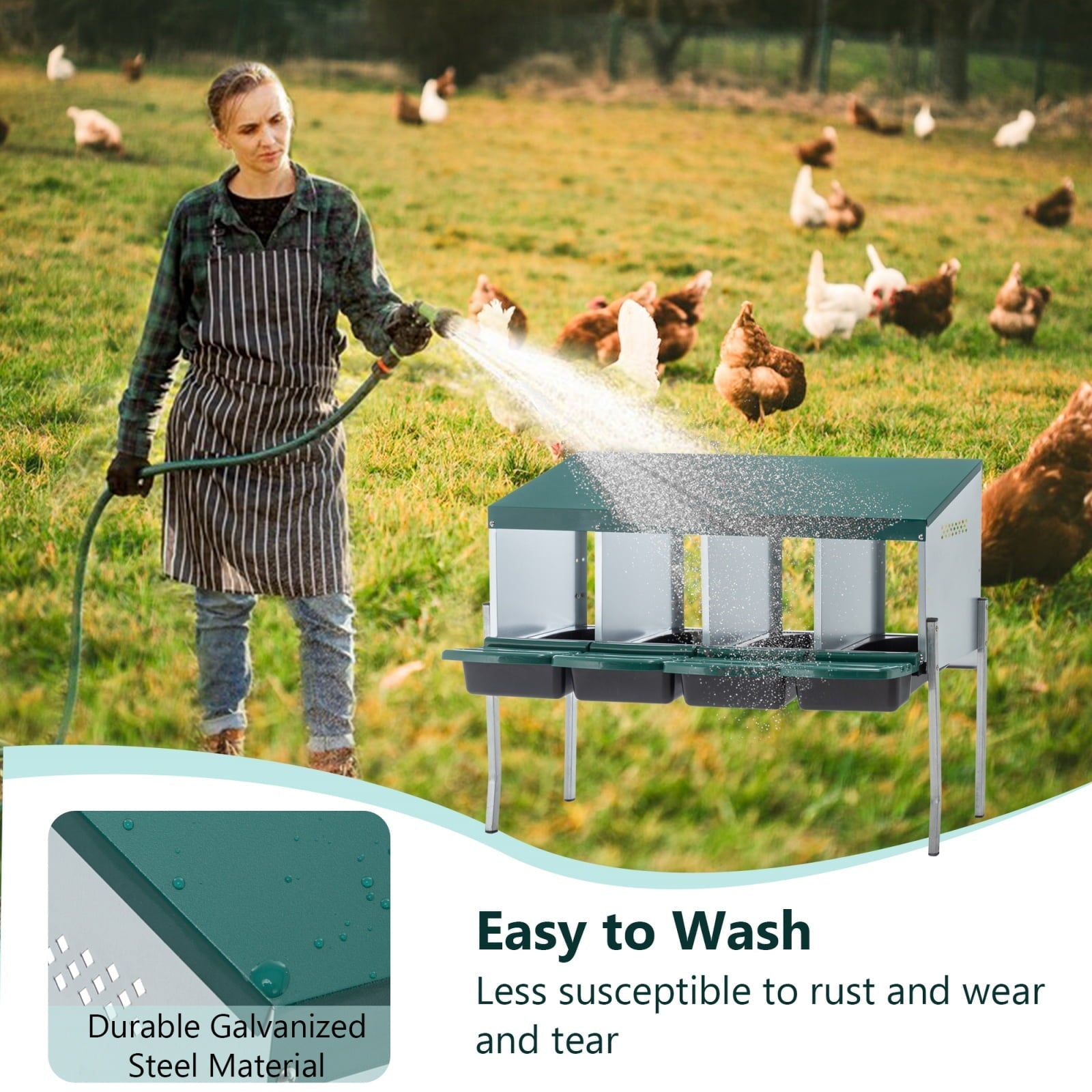 Upgrade your coop with our Professional Chicken Nesting System, combining military-grade durability with innovative egg collection technology. This 4-hole galvanized steel nest box simplifies poultry care while keeping eggs pristine and protected.
