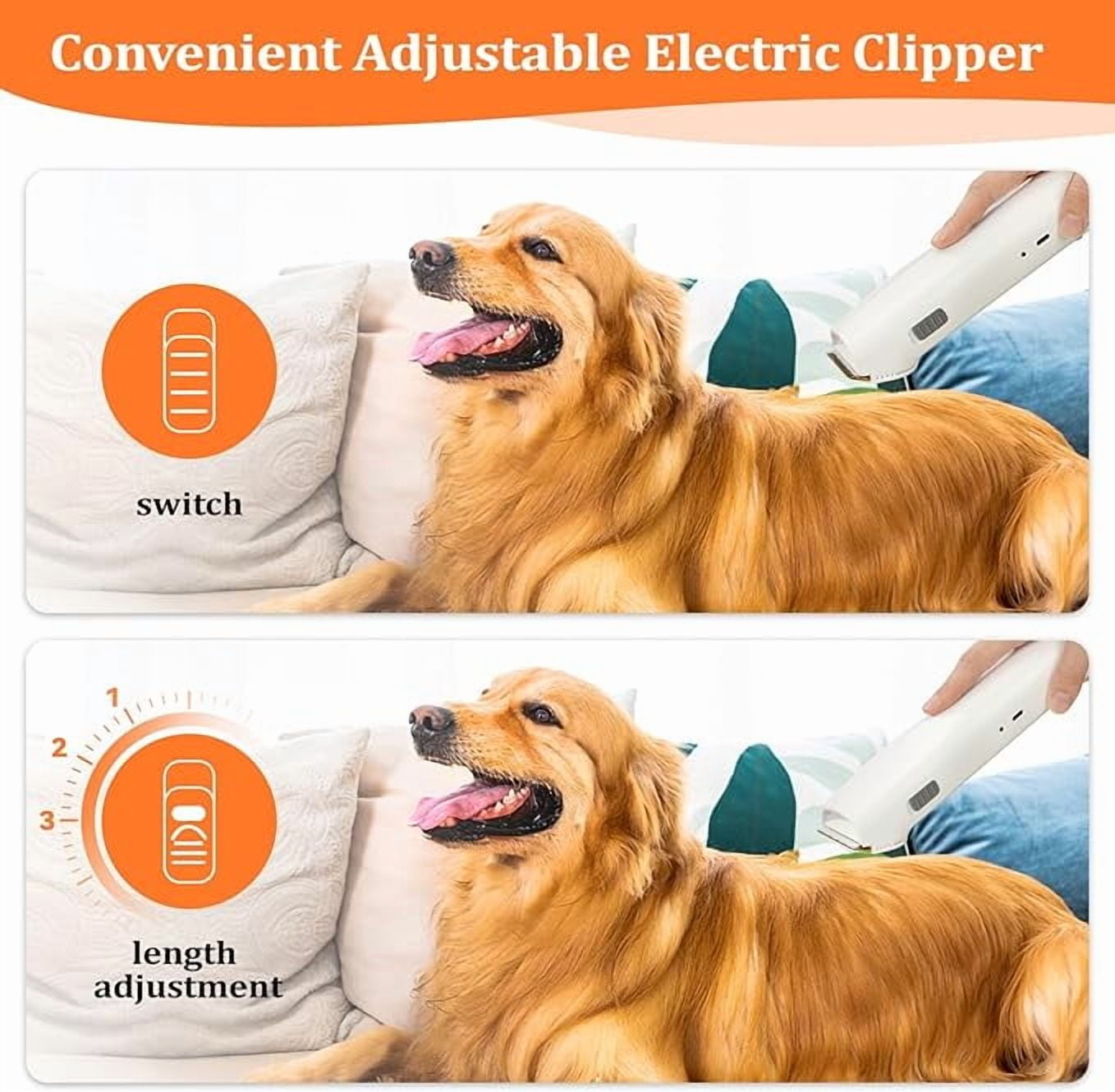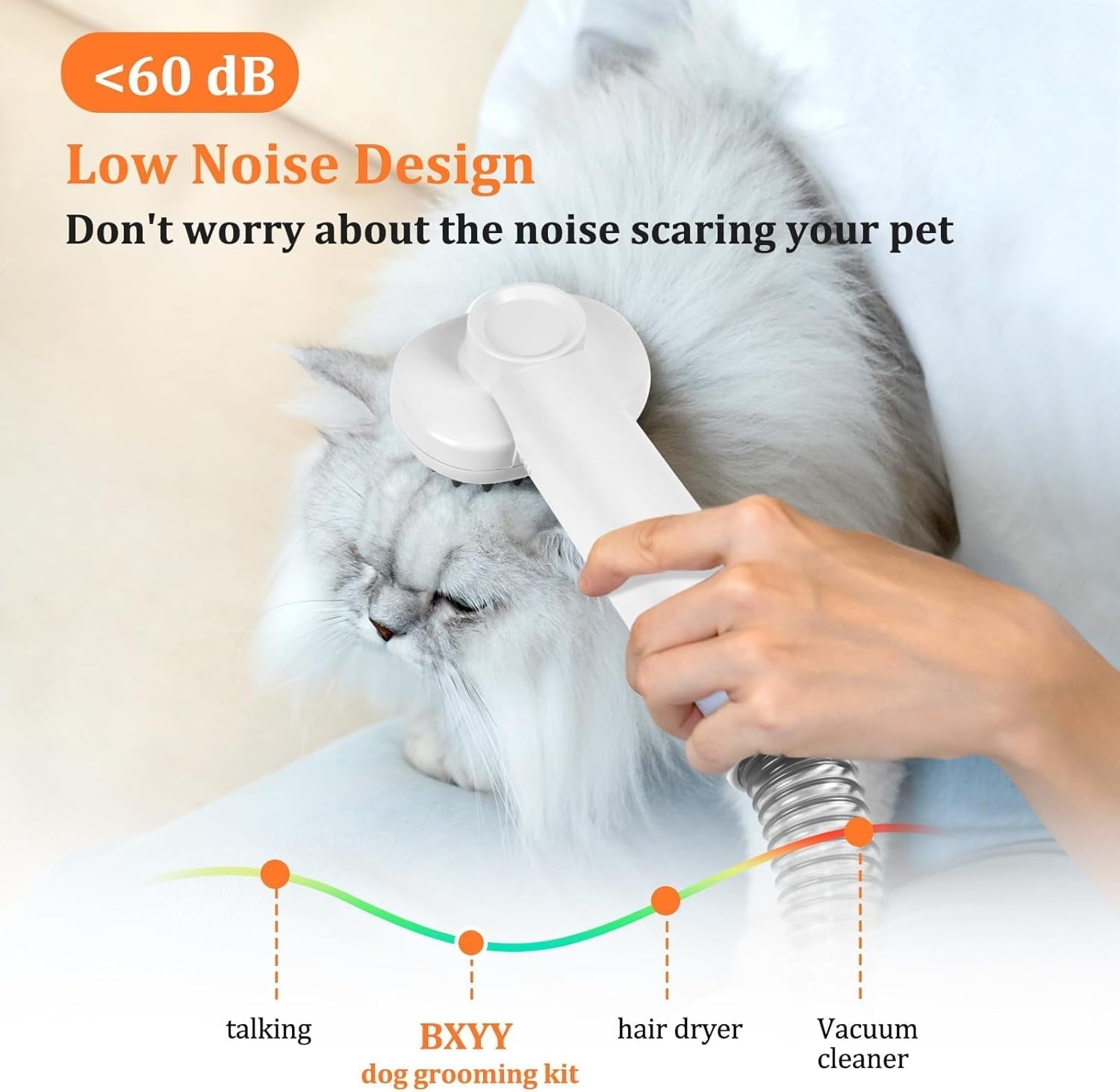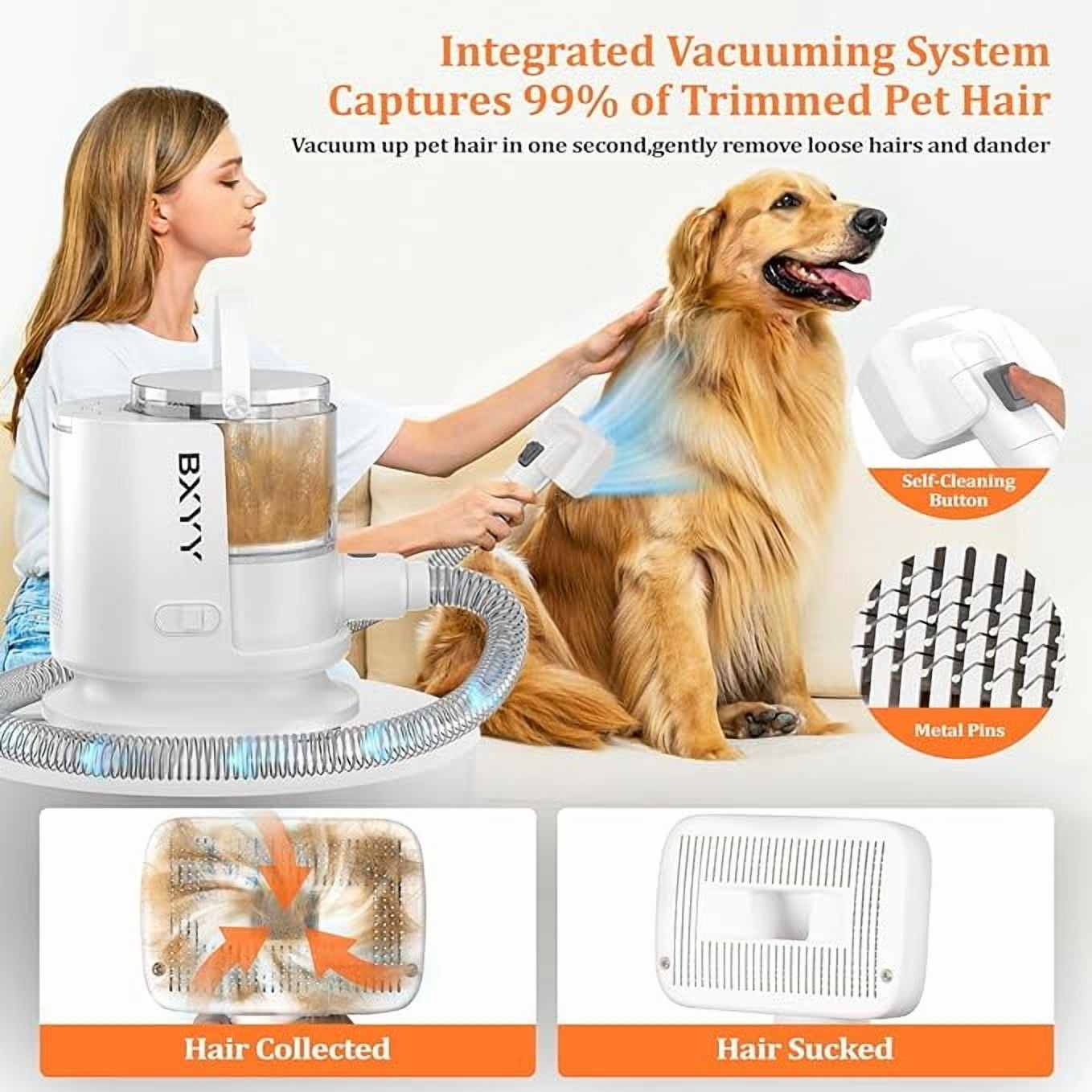 - All-in-One Pet Grooming Solution Includes 5 professional tools: grooming brush, de-shedding brush, cleaning brush, nozzle tool, and cordless clipper—designed for daily coat care, trimming, and cleanup. Powerful 13kPa Suction for Efficient Hair Removal Strong suction quickly captures pet hair and dander directly into the 2.5L dust container, keeping your home cleaner during grooming. Low-Noise Operation for Pet Comfort Designed with reduced noise output to minimize stress for sensitive pets, helping create a more relaxed grooming experience at home. Cordless Clipper for Flexible Use Rechargeable clipper works independently for convenient trimming, while remaining easy to handle with or without the vacuum connected. Large 2.5L Dust Cup with Easy Emptying Extra-large dust container allows for extended grooming sessions with less emptying; removable design for quick, mess-free disposal.