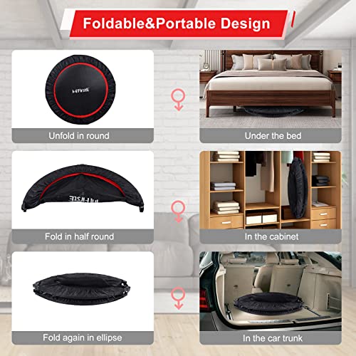 - Foldable Oxford Pad: FirstE Mini trampoline main frame is foldable, four holes construct allows you to fold trampoline without taking off the pad. Folding design is convenient to save space and easy to store it under the bed and sofa. Even when you are traveling outdoors, you can also put the exercise trampoline in the trunk. Portable for indoor or outdoor activities