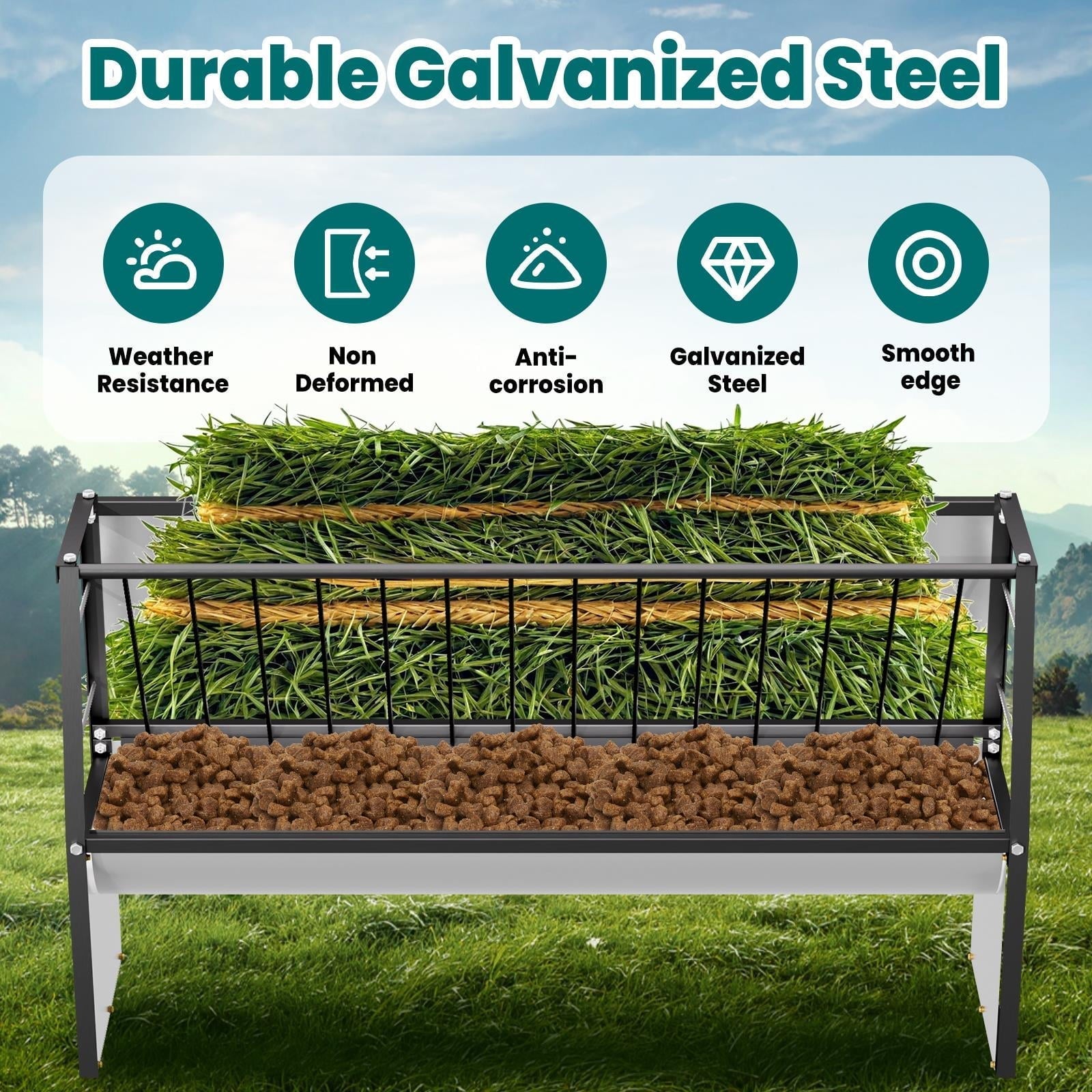 60 Gallon Feeder, Galvanized Steel Livestock Hay Feeder with 35 & 25 Gallon Compartments, Ideal for Goats, Cows in Outdoor Pasture, Ranch, Stable