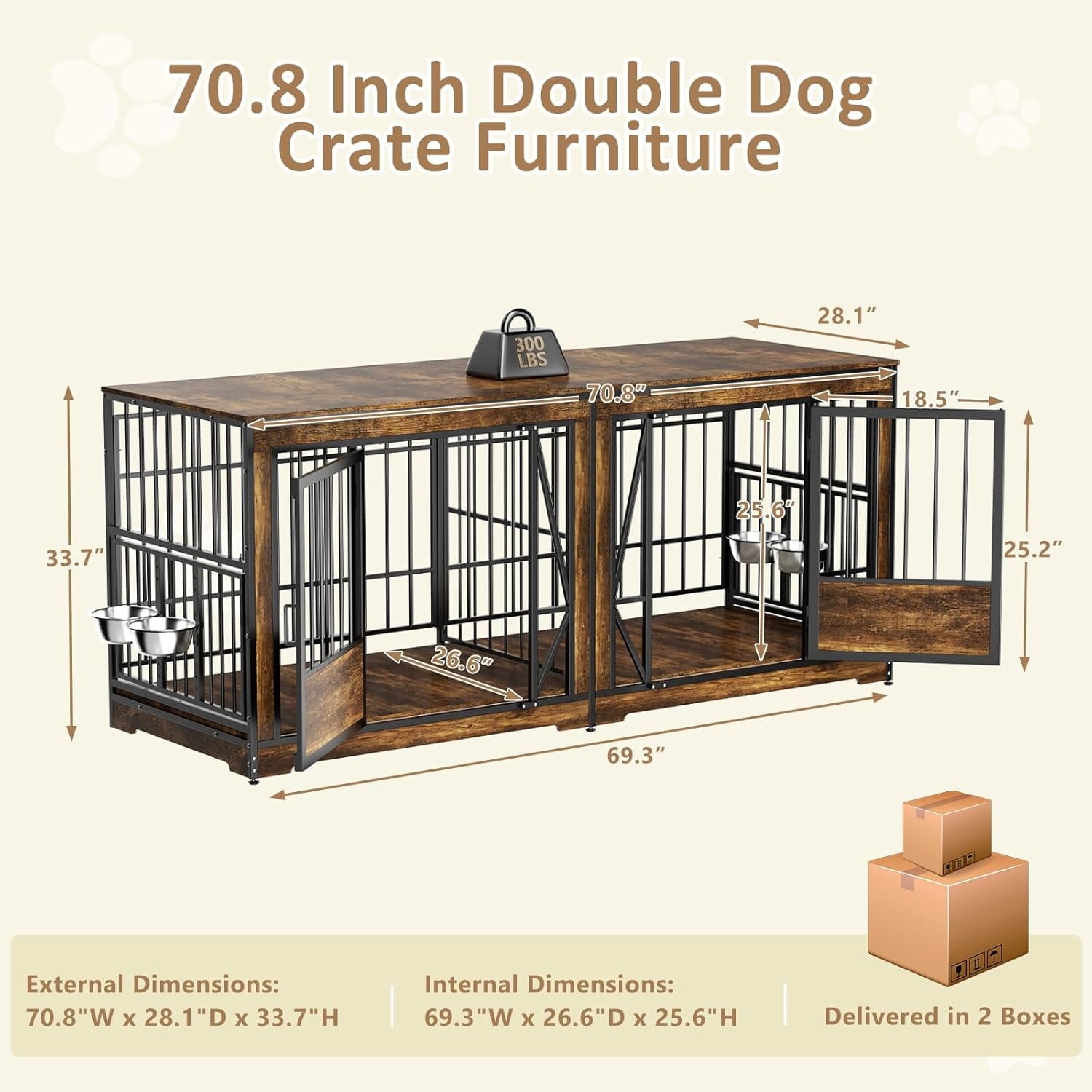 If you want your dogs to have a large separate room, you can remove the middle divider.Designed for large dogs, this double dog crate is large enough to comfortably stand, turn and stretch.BEURUKU Double Dog Crate FurnitureAdd to CartAdd to CartAdd to CartCustomer Reviews4.5 out of 5 stars2174.5 out of 5 stars2174.5 out of 5 stars2174.5 out of 5 stars2174.5 out of 5 stars2174.5 out of 5 stars217Price—$379.99$379.99$279.99$279.99$275.99$275.99——ColorGreyRustic BrownGreyRustic BrownGreyRustic BrownOverall Size86.6'L x 30.7'W x 38.2'H86.6'L x 30.7'W x 38.2'H70.8'L x 28.1'W x 33.7'H70.8'L x 28.1'W x 33.7'H60.6'L x 23.6'W x 33.7'H60.6'L x 23.6'W x 33.7'HInner Size84.6'L x 28.9'W x 32.5'H84.6'L x 28.9'W x 32.5'H69.3'L x 26.6'W x 25.6'H69.3'L x 26.6'W x 25.6'H59'L x 22'W x 25.6'H59'L x 22'W x 25.6'HAdjustable Dividerwith Bowls444444Adjustable BowlsMaterialEngineered Wood, MetalEngineered Wood, MetalEngineered Wood, MetalEngineered Wood, MetalEngineered Wood, MetalEngineered Wood, Metal