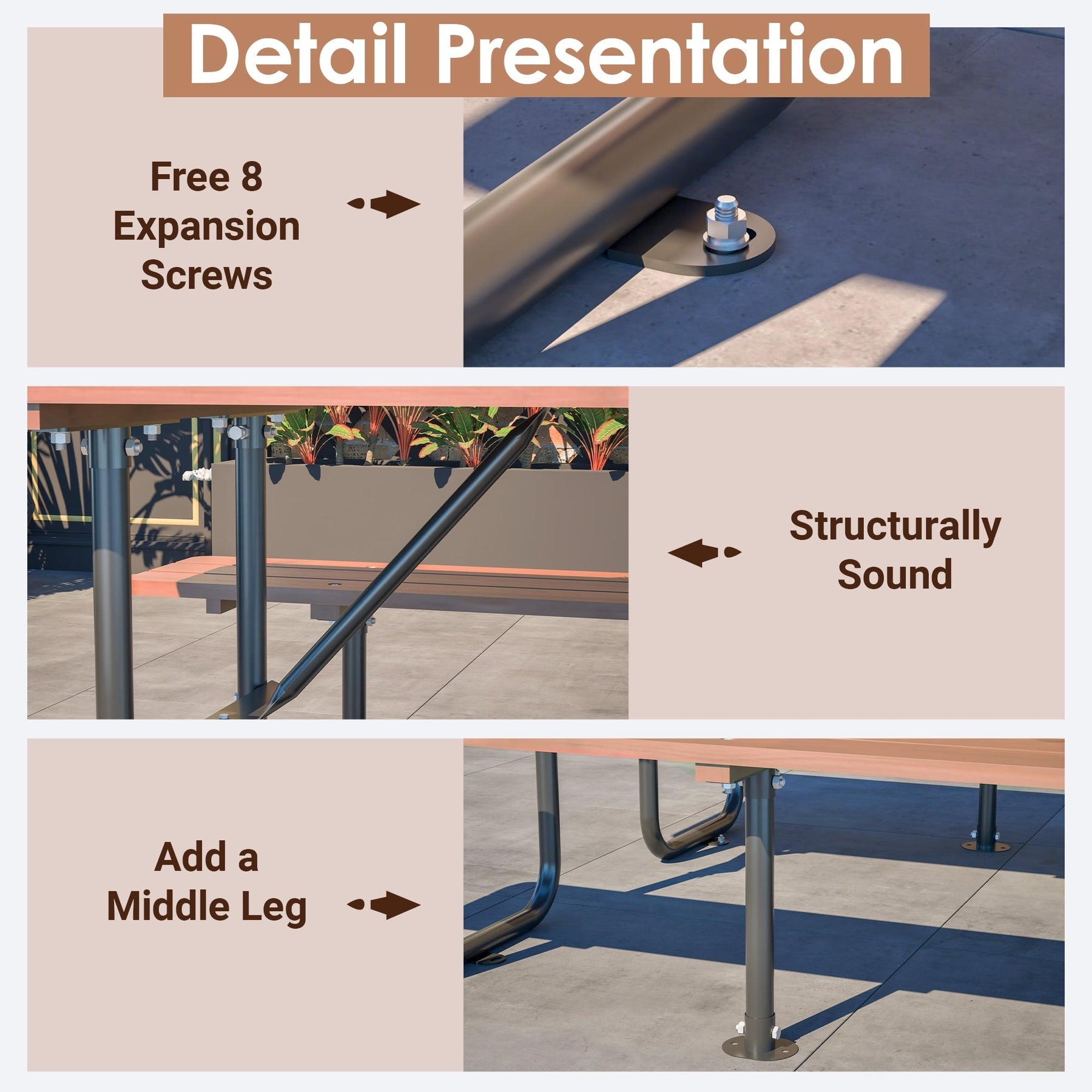 Made of fir wood that restores the texture of real wood, our this outdoor picnic table with benches has beautiful wood grain and bright color. Besides, it does not deform easily in the climate with high temperature. Patented structured by strong metal frame, this picnic table with benches is stable and sturdy.Our structure is patented to ensure a unique and comfortable sitting experience for you . The table can hold up to 350 lbs, and each bench has the maximum weight capacity of 800 lbs. The picnic table set is ideal for outdoor use so that you can enjoy your leisure time with it in the backyard, balcony and so on. In addition, the umbrella hole design allows you to use it with a sunshade.