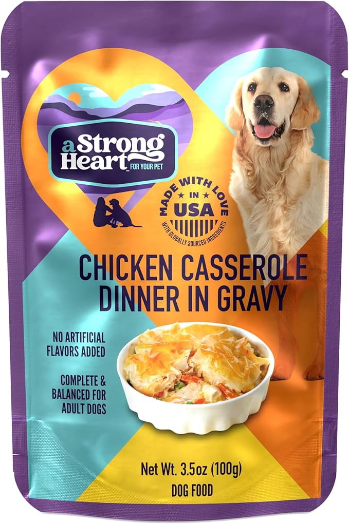 Treat your furry friend to a comforting, nutritious meal with A Strong Heart Wet Dog Food Pouches, Chicken Casserole Dinner in Gravy. Made in the USA with real chicken as the first ingredient, this homestyle-inspired recipe offers high-quality protein to support muscle health and energy. Each 3.5 oz pouch is packed with essential vitamins and minerals, delivering balanced nutrition for a glossy coat and overall vitality. The rich, savory gravy adds mouthwatering flavor, while the gentle formula is easy on sensitive stomachs. With no artificial flavors, every bite is a wholesome, love-filled experience your dog will crave.