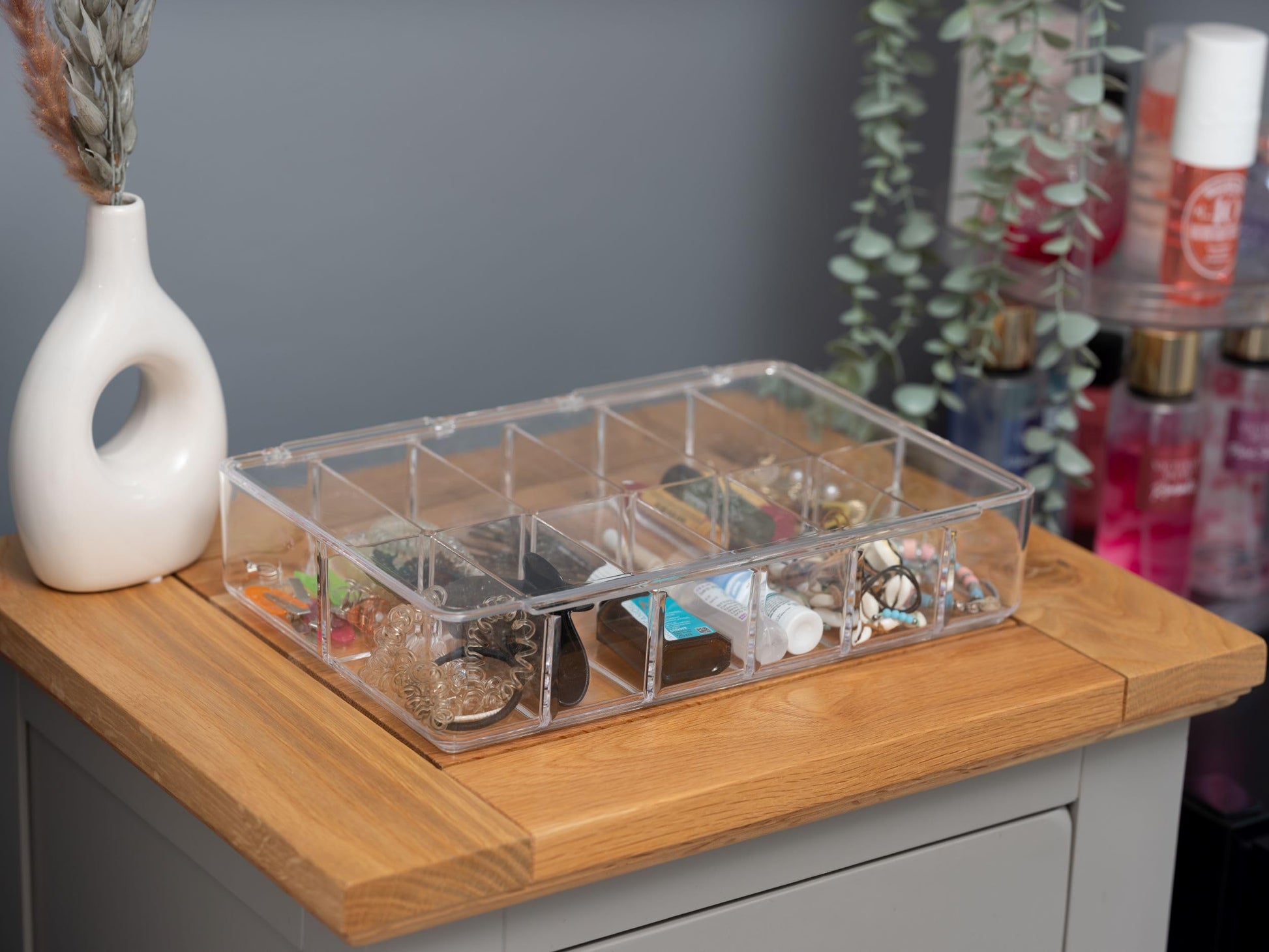 - Perfect multi compartment storage container with 12 separate sections enclosed with an overall lid; Ideal for assortments of jewellery, smaller items or craft hobby DIY bits and fixings; For bedroom, cupboard, shed or desk office storage; Full opening lid with transparent finish ensures everything is always visible easy to find and accessible