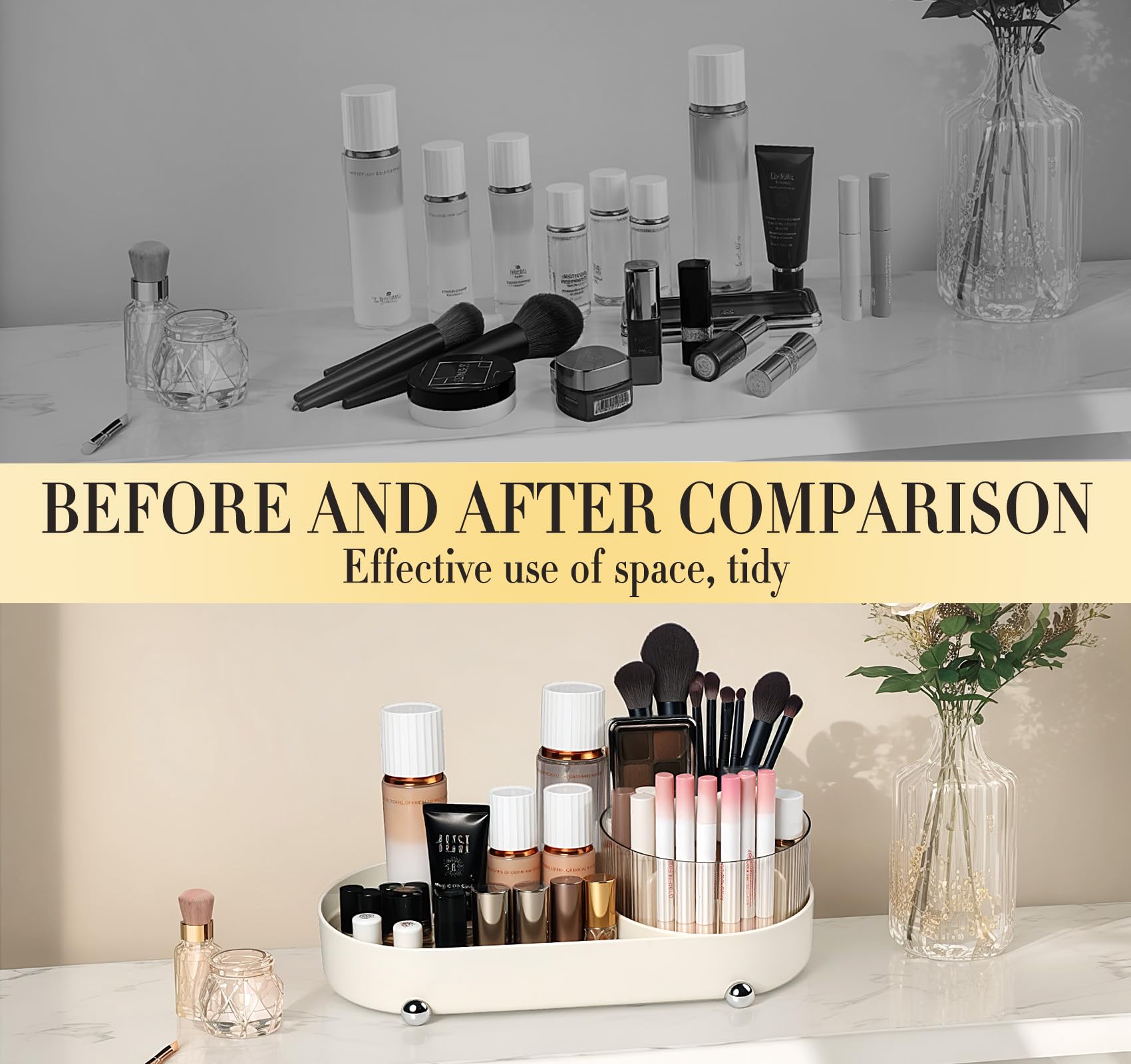 - Large Capacity: The size of this cosmetics organiser box is 34 * 15.5 * 14.5cm, with 4 large compartments; The size of the 360 ° rotatable part is: with 8 small compartments; It provides ample storage space for your cosmetics, allowing for the storage and display of various cosmetics