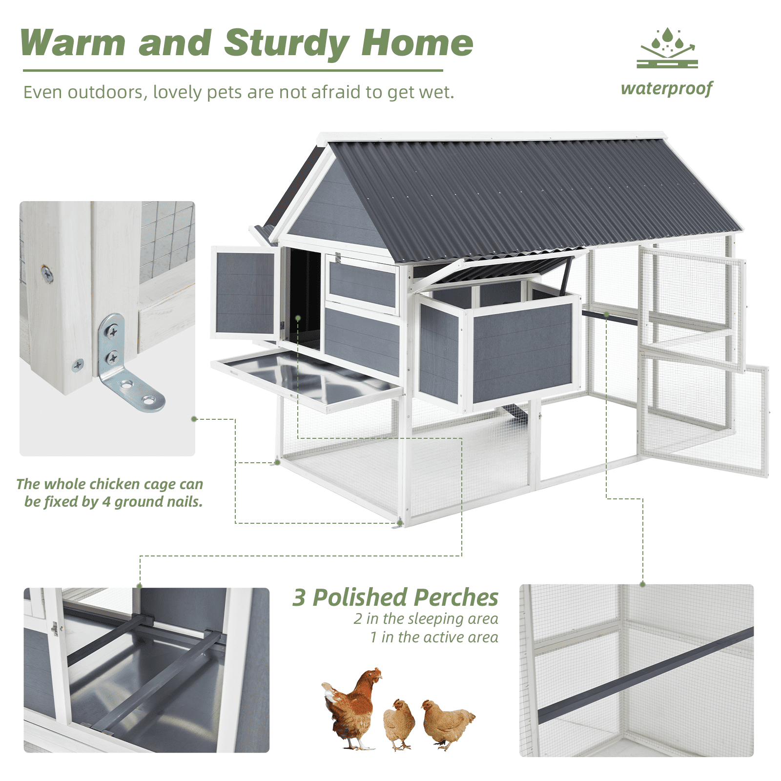 - π₯ Egg-Collecting Made Simple Two large nesting boxes make gathering eggs a breeze. Plus, the removable tray helps keep the coop tidy, and with three perches inside, your chickens have plenty of comfy spots to roost day and night.