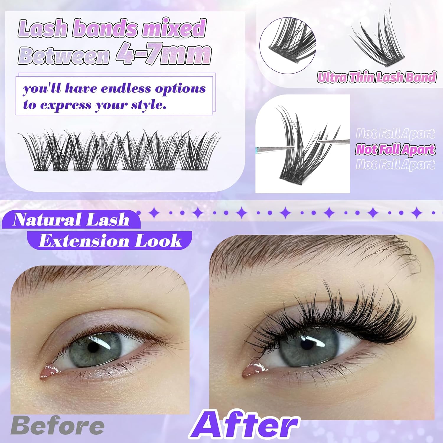 - Simple 5-Minute Eyelashes Clusters: Our cluster lash extensions are designed to add a natural look and feel to your eyes with ease and convenience, leaving you with a flawless and effortless look that lasts all day. Whether you're a beginner or a pro, our individual lash clusters are easy to apply and will instantly enhance your natural beauty.