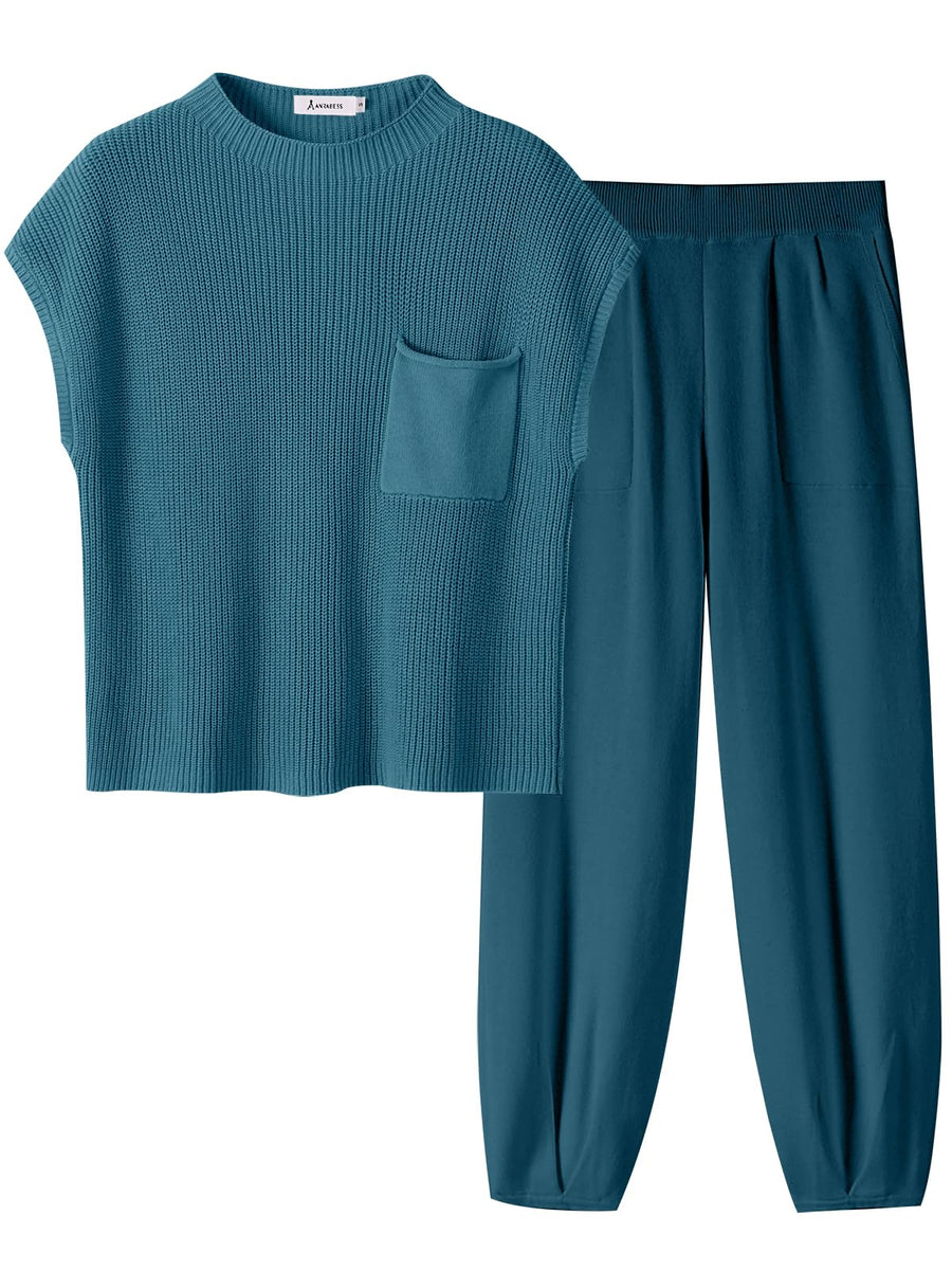 ANRABESS Women's Two Piece Outfits Knit Sweater Pullover Crop Top & Pants Lounge Matching Tracksuit Sweatsuit Sets 2024 Trendy Loungewear Clothes Blue X-Small