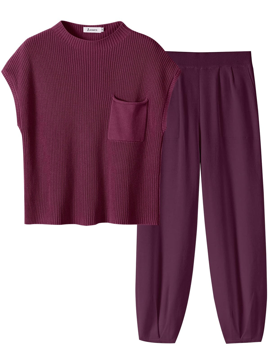 ANRABESS Women's Two Piece Outfits Knit Sweater Pullover Crop Top & Pants Lounge Matching Tracksuit Sweatsuit Sets 2024 Trendy Loungewear Clothes Burgundy X-Small