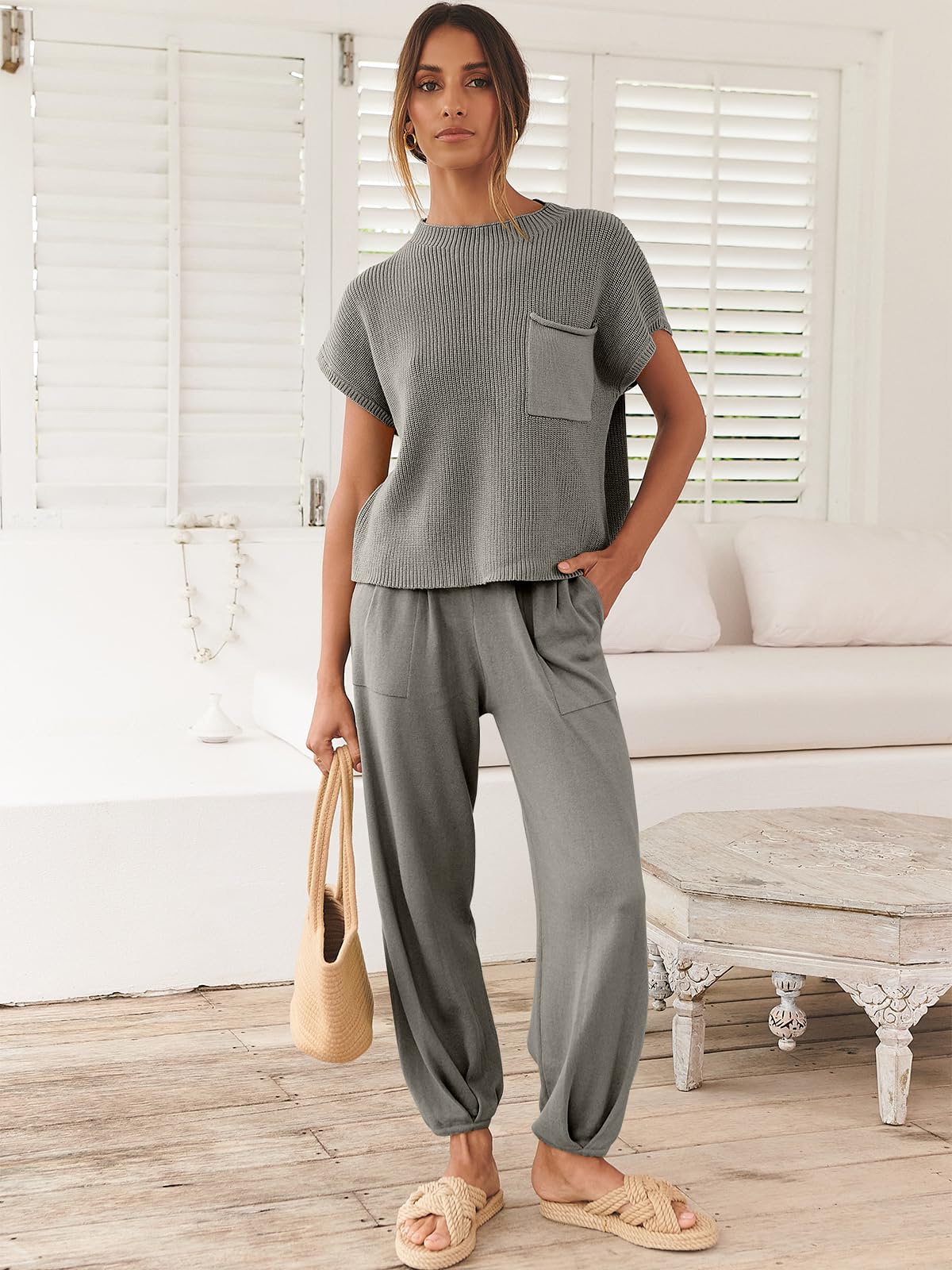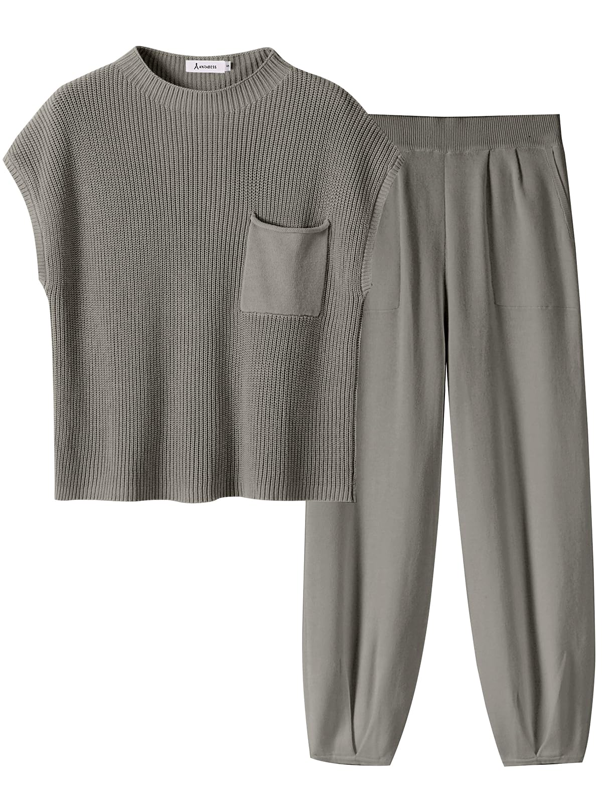 ANRABESS Women's Two Piece Outfits Knit Sweater Pullover Crop Top & Pants Lounge Matching Tracksuit Sweatsuit Sets 2024 Trendy Loungewear Clothes Grey X-Small
