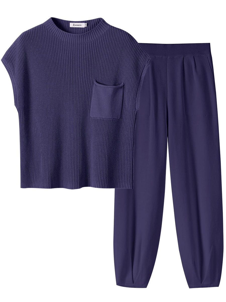 ANRABESS Women's Two Piece Outfits Knit Sweater Pullover Crop Top & Pants Lounge Matching Tracksuit Sweatsuit Sets 2024 Trendy Loungewear Clothes Purple X-Small