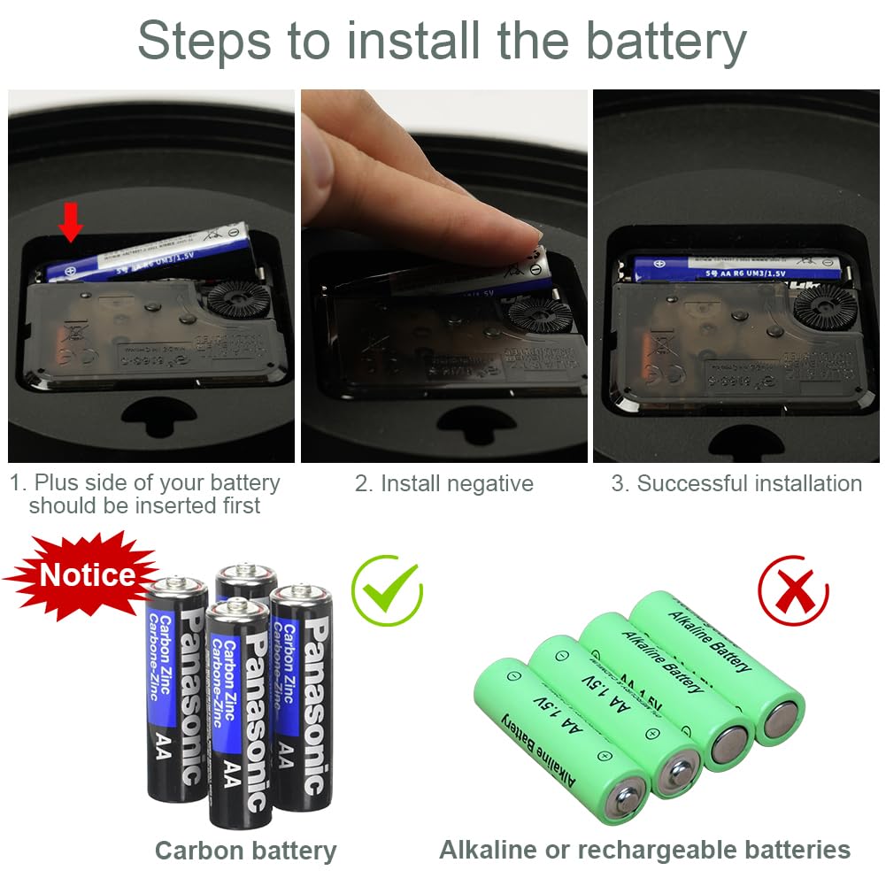 - 🕘【Battery Powered】The wall clock is powered by 1 AA carbon battery, the battery can be replaced, please do not use high-power batteries. Note: Batteries need to be purchased separately. (not included), we do not recommend the use of high load batteries.
