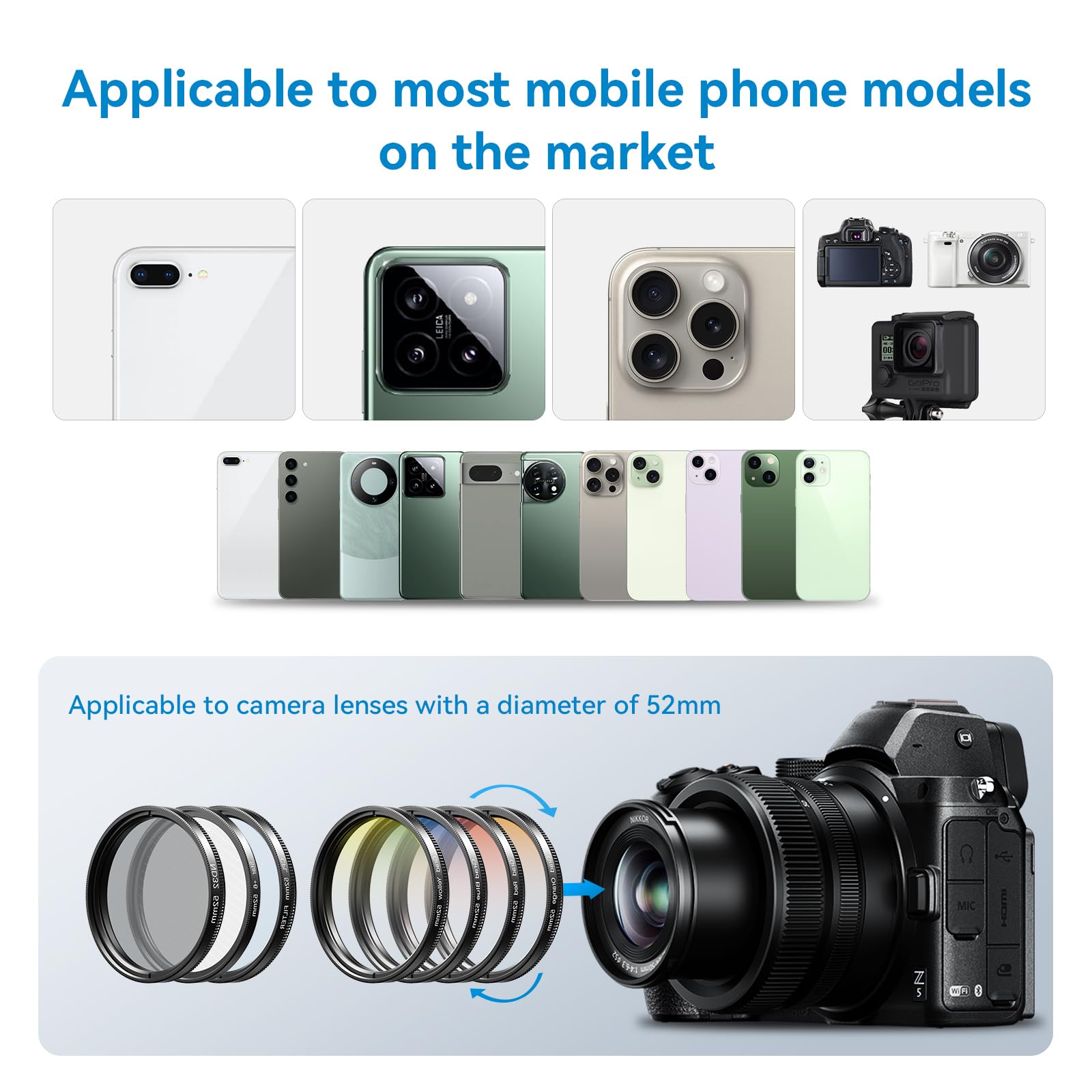 - 【Advanced technology】This 52mm mobile phone filter uses high-quality optical glass and aluminum alloy frame to enhance the overall texture. The clip contains silicone gasket to prevent scratches on the phone