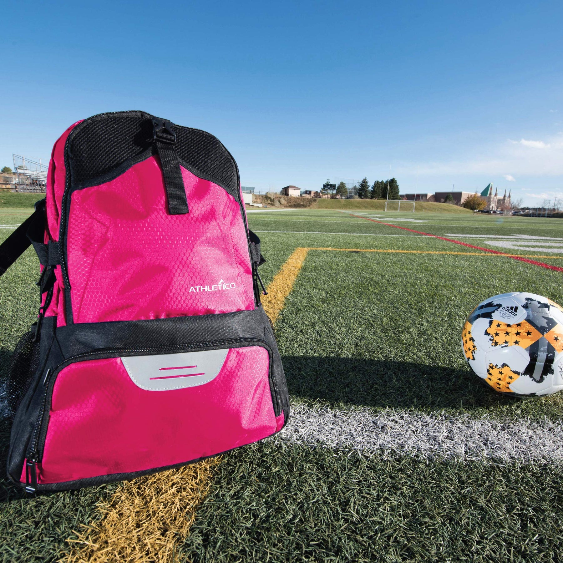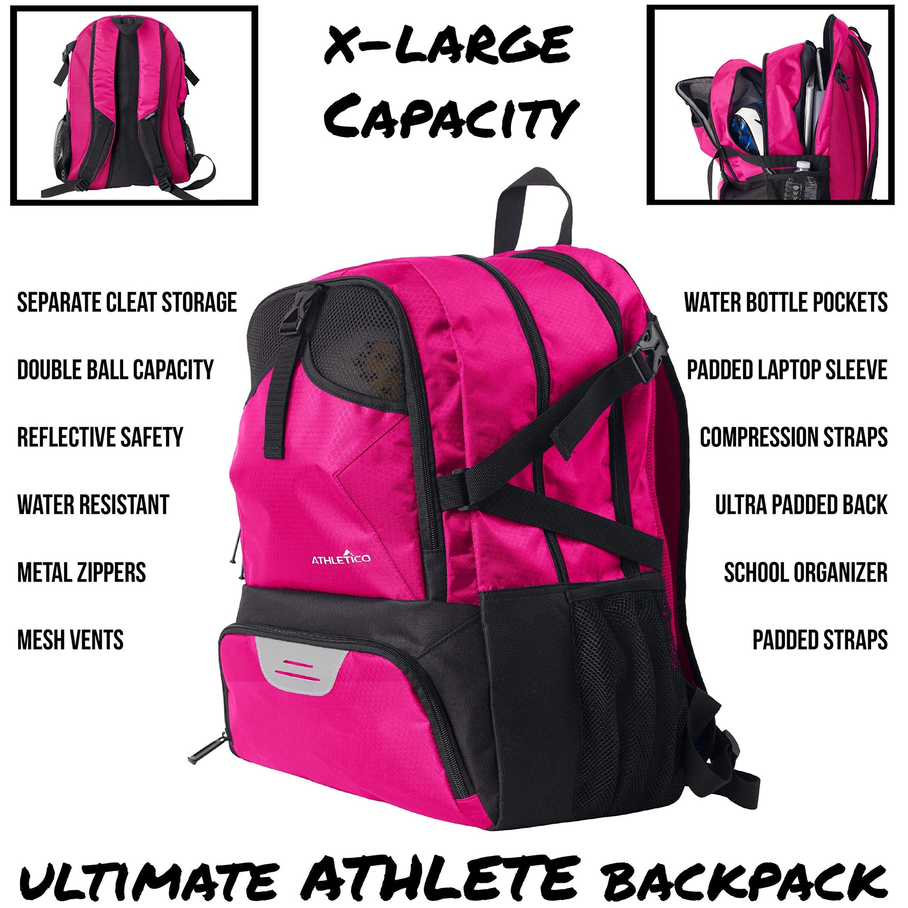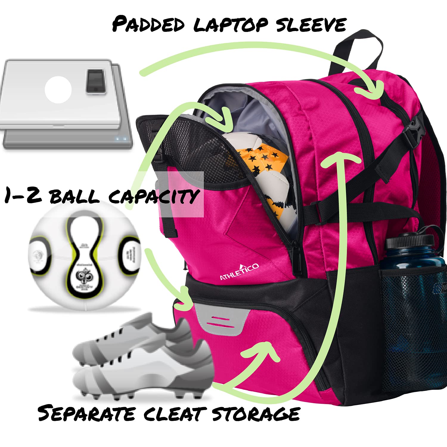 Details: Athletico National Soccer Backpack. The Ultimate Sports Bag. Designed to accommodate players of all ages, this soccer equipment backpack lets soccer players easily carry all of their gear in one bag. Carry up to TWO SOCCER BALLS, with a separate compartment to contain dirty cleats, double water bottle holder, accessories organizer, and padded laptop/tablet sleeve, this backpack has it all. Designed to conveniently carry everything a player needs, on and off the field. Ideal for soccer, school, or work. Backpack size: 19.5 x 14 x 12 in [50 x 36 x 30 cm] Beyond its storage capacity, this soccer ball backpack is designed with padded, adjustable straps for a comfortable, ergonomic fit. Made with durable polyester and nylon fabric, this soccer bag is lightweight, yet rugged enough to withstand rain, mud, and dirt, allowing players to haul their gear in all weather conditions and outdoor environments. The ventilated back and pockets allow for exceptional airflow, keeping players comfortable and preventing odors caused by sweat and dirt. Great for competitive and recreational players alike, this soccer pack is designed to make storage and transportation simple and convenient.