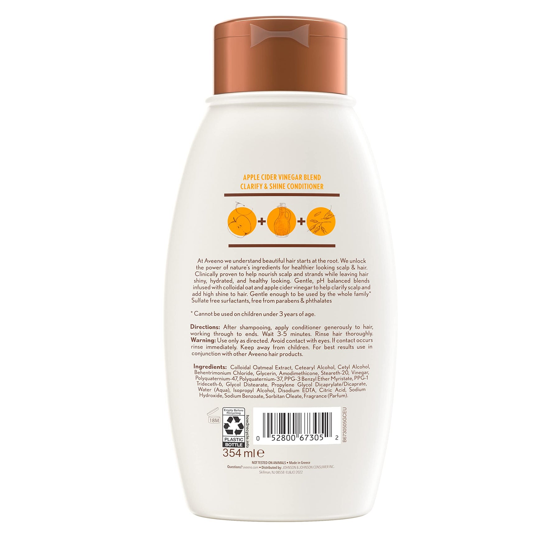 Details: Clarify and nourish your hair with Aveeno Apple Cider Vinegar Conditioner. This nourishing conditioner helps promote a healthy scalp while cleansing and reinforcing shine. Great for oily, dull hair, the apple cider vinegar formula leaves hair feeling healthy, clean and shiny. Part of the Aveeno Scalp Soothing Haircare Collection, this conditioner contains oat as the first ingredient, which is known for its soothing and moisturizing properties. All Aveeno hair care products are made with balanced blends of wholesome ingredients and are free from sulfates, parabens and dyes. Aveeno is known for bringing the soothing and healing properties of nature to skin care and now offers nourishing care for your scalp and hair. We’re not only mindful of what goes into our formulations, but also of our impact on the world around us. To use: After shampooing, apply conditioner generously to hair, working through to ends. Wait 3 – 5 minutes, and then rinse hair thoroughly. Start with Apple Cider Vinegar Shampoo for the optimal clarifying routine.