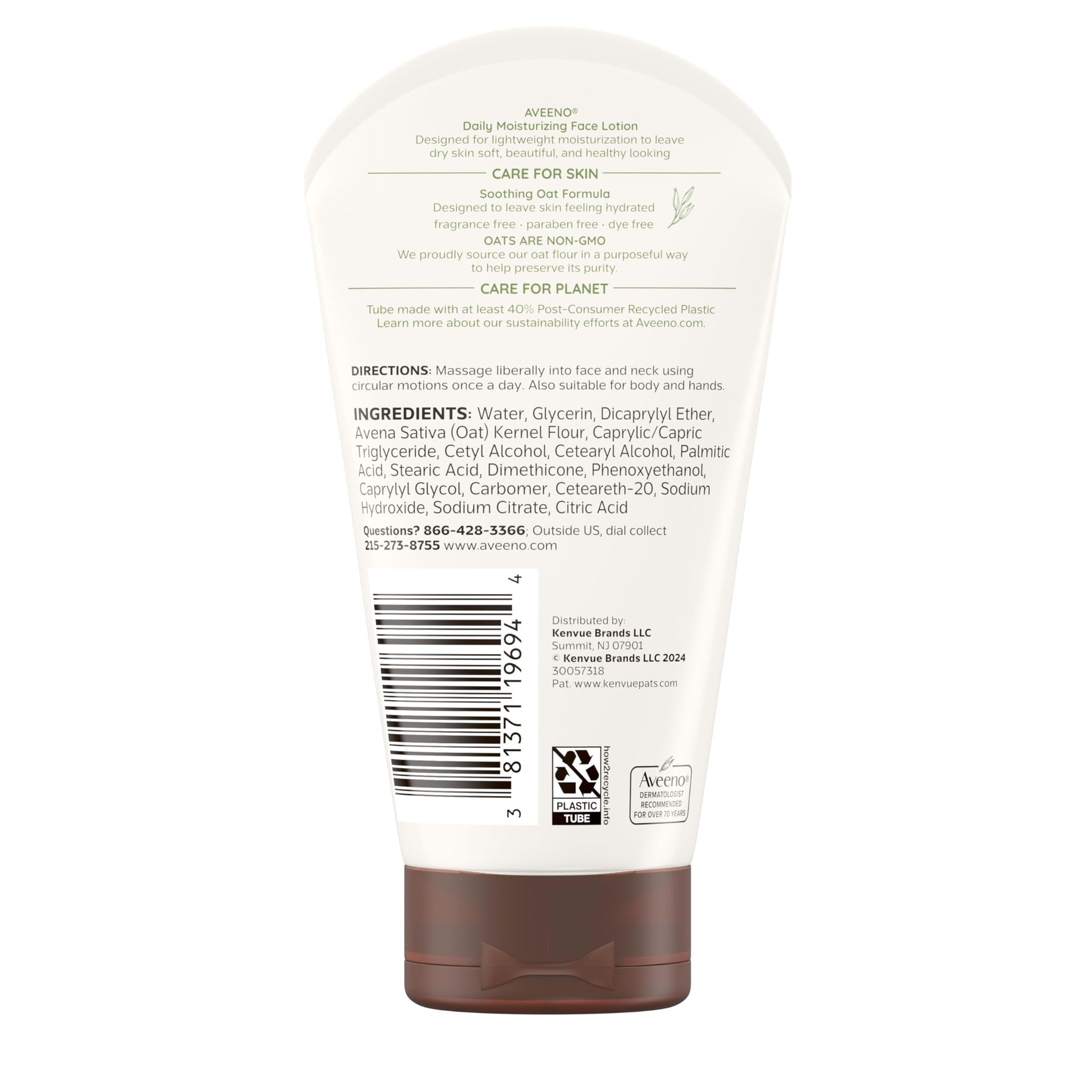 Details: Intensely hydrate and nourish your sensitive skin with Aveeno Daily Moisturizing Face Lotion. This lightweight face moisturizer is formulated to intensely replenish dry skin to leave it soft, beautiful, and healthy-looking. The daily face lotion is enriched with nourishing prebiotic oat to help strengthen the skin's natural moisture barrier and is clinically proven to moisturize dry skin for 24 hours. This daily moisture lotion has been specifically formulated for the face and is free of fragrance, parabens, and dye and it is suitable for sensitive skin. To use this non-greasy facial moisturizer to lock in moisture on your face, simply massage liberally into the face and neck using circular motions once a day and the lotion will do the rest. This gentle lotion for sensitive skin is also suitable for use on your body and hands. Get the glow with Aveeno, the dermatologist-recommended skincare brand for over 70 years.