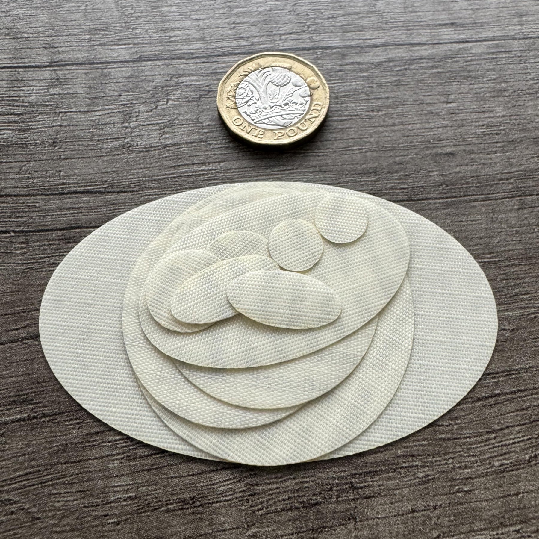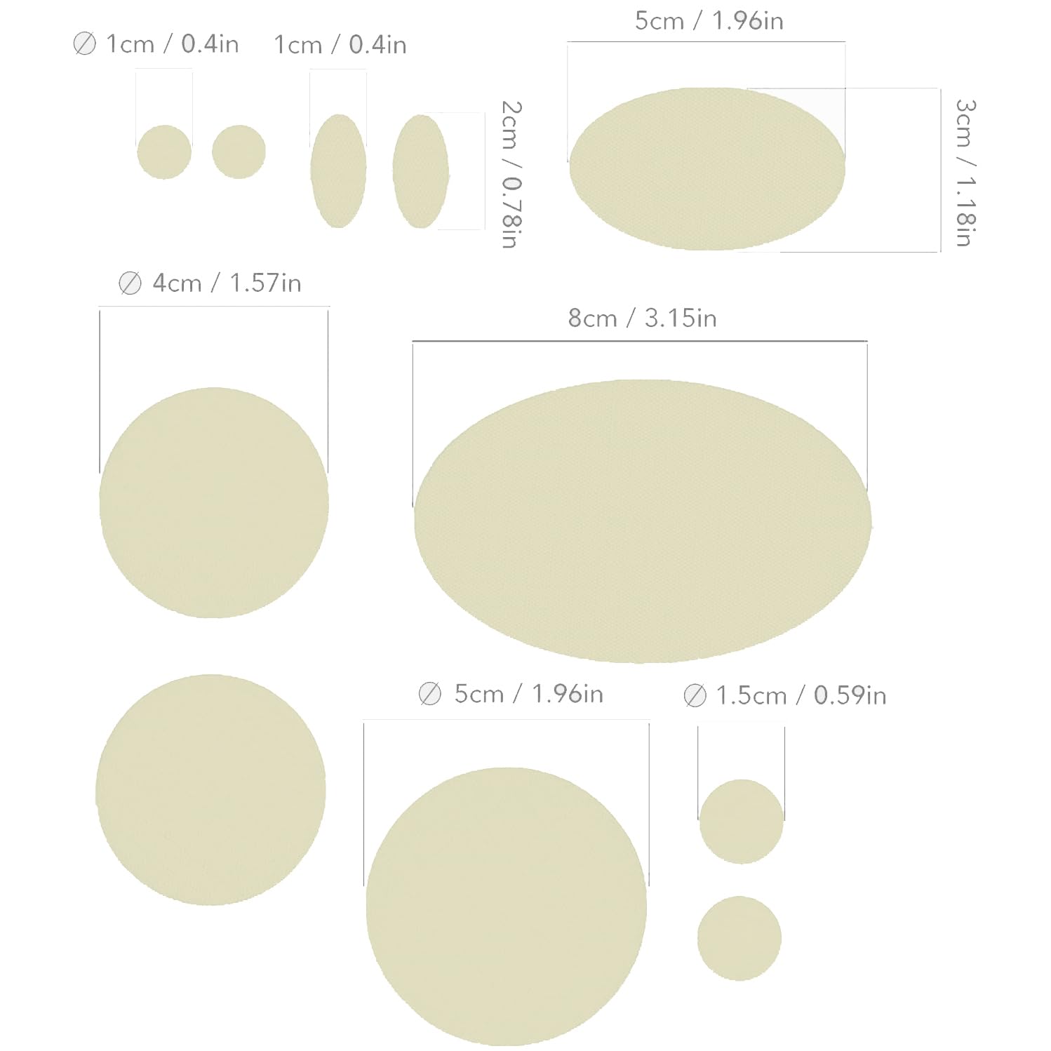 • 11 DIFFERENT SHAPES AND SIZES - each mending set includes 11 pre-cut, self-adhesive, high-quality, soft patches (1 oval 3.15x1.9in, 1 oval 1.18x1.96in, 2 ovals 0.4x0.78in each, 1 circle 1.96in diameter, 2 circles 1.57in, 2 circles 0.59in and 2 circles 0.4in)