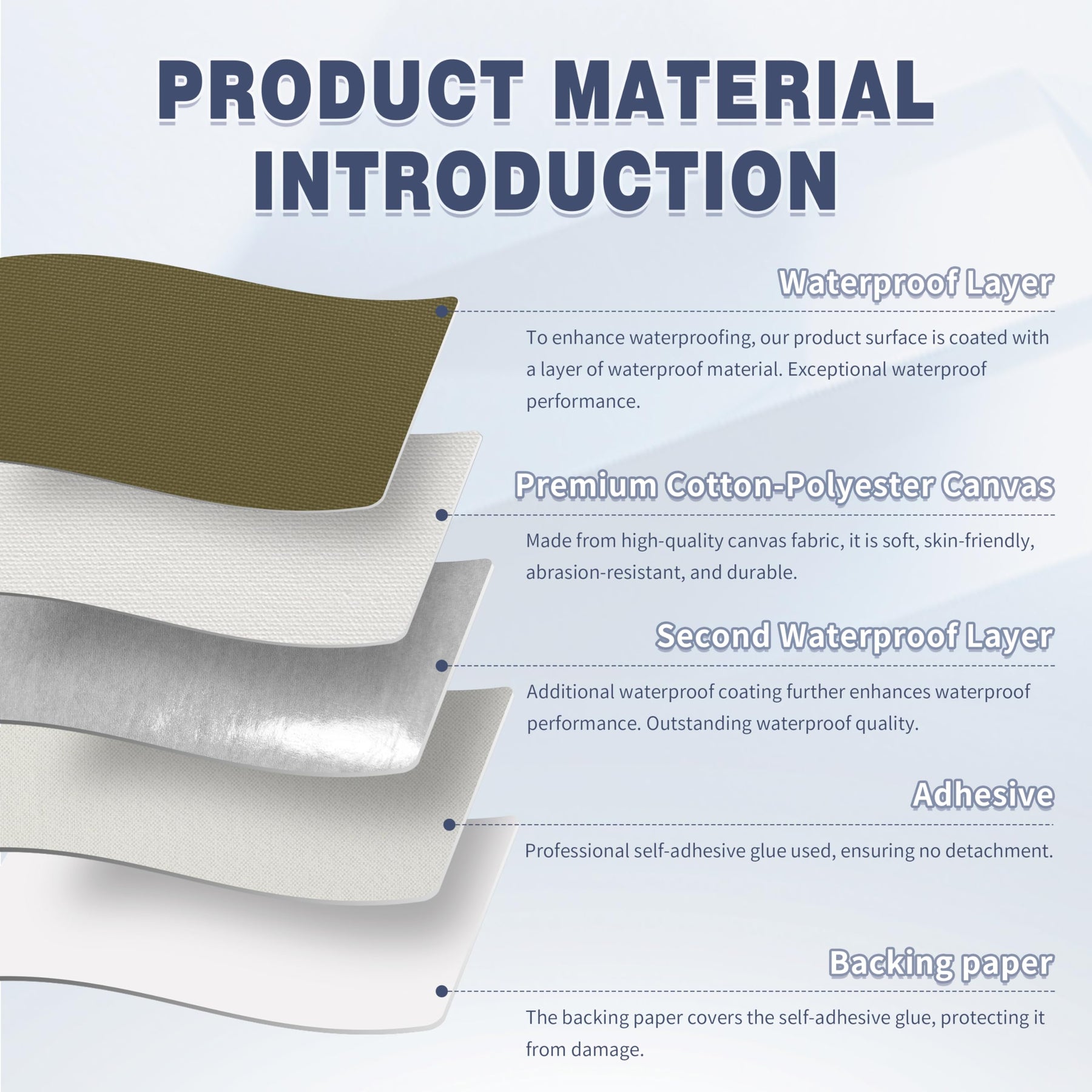 - [Outstanding Product Performance]: This canvas repair patch boasts two waterproof layers, providing exceptional waterproofing. Crafted from high-quality polyester-cotton canvas, it offers better abrasion resistance compared to traditional all-cotton materials.Carefully selected from 17 types of self-adhesive glue available in the market, it is more suitable for various fabric surfaces, less likely to lift at the edges, and leaves no residue when removed (It doesn't damage the repaired items).