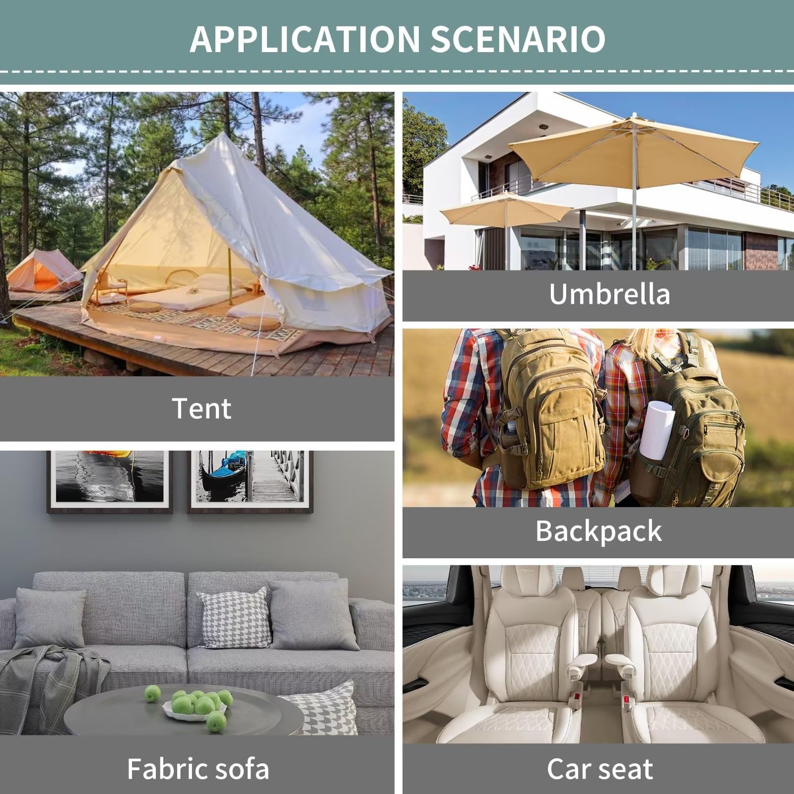- [Applicable scenarios]: The canvas repair kit is suitable for repairing various outdoor equipment such as tents, sunshades, awnings, sails, canopy,sofas.The fabric patch can easily refurbish and repair various damages, eliminating the need to purchase new furniture or outdoor gear.