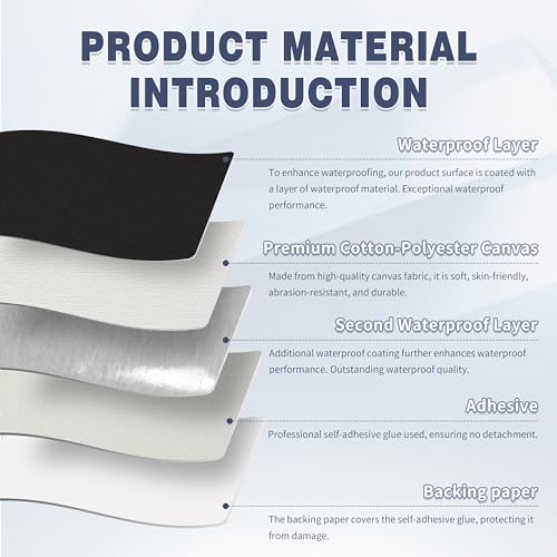 - [Outstanding Product Performance]: This canvas repair patch boasts two waterproof layers, providing exceptional waterproofing. Crafted from high-quality polyester-cotton canvas, it offers better abrasion resistance compared to traditional all-cotton materials.Carefully selected from 17 types of self-adhesive glue available in the market, it is more suitable for various fabric surfaces, less likely to lift at the edges, and leaves no residue when removed (It doesn't damage the repaired items).