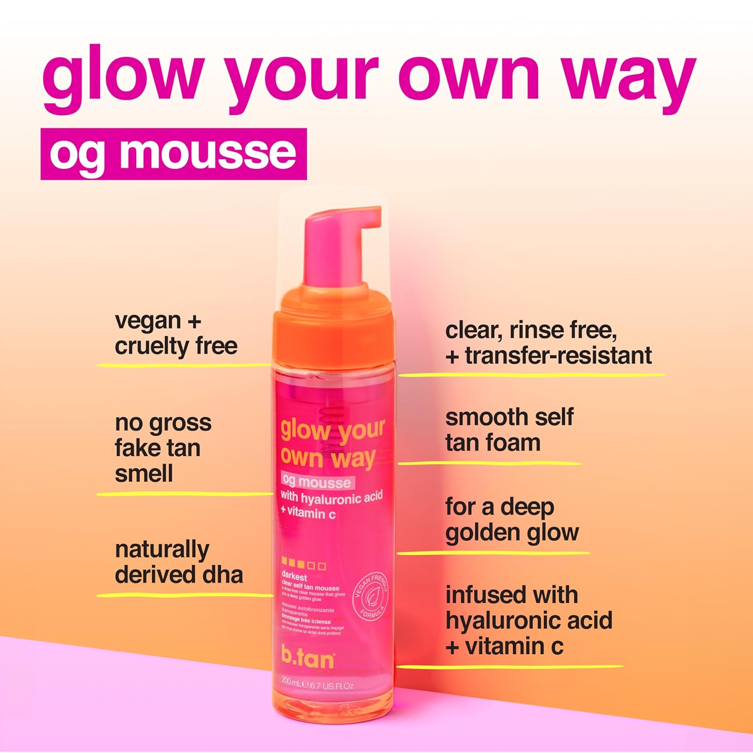 - CLEAR BRONZING WATER. i’m a transfer-resistant self tan mousse that you can apply & go glow your own way... no rinse required