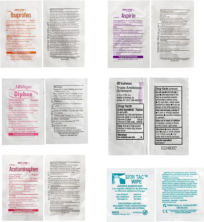• Contents: Includes a variety of bandages, insect sting relief, antiseptic wipes, antibiotic ointment, medication moleskin, alcohol swabs, a splinter picker and a safety pin