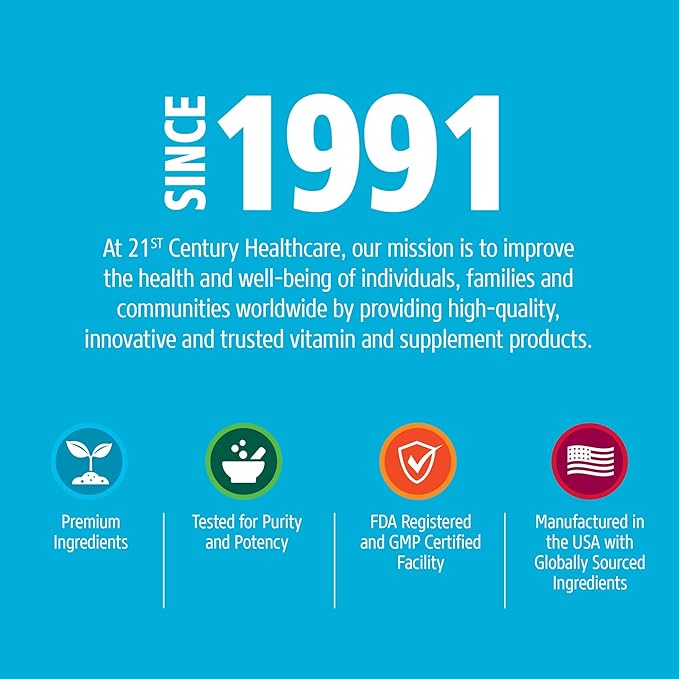 • GUARANTEED QUALITY: 21st Century HealthCare manufactures over 500 vitamins and nutritional supplements that are trusted to be 100% safe, contain the purest ingredients and are guaranteed for label potency.