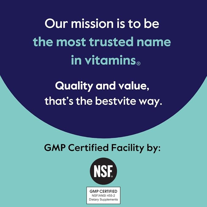 • NSF GMP CERTIFIED: Bestvite’s facility is NSF/ANSI 455-2 Dietary Supplements Good Manufacturing Practice (GMP) certified. Earning GMP certification from NSF verifies that a manufacturing facility has the proper methods, equipment, facilities, and controls in place to produce dietary supplement products.