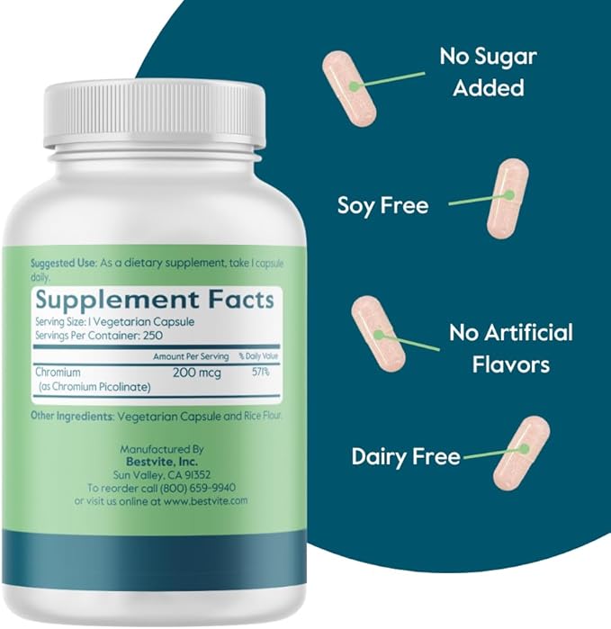 - PURE FORMULA: Bestvite Chromium Picolinate contains no stearates, is non-GMO, gluten-free, and vegan. Each capsule contains 200mcg of Chromium Picolinate.