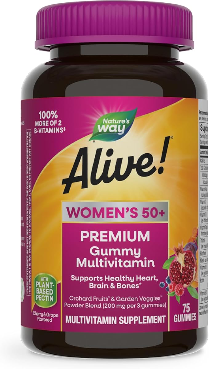 Nature’s Way Alive! Women’s 50+ Premium Gummy Multivitamin, Supports Healthy Heart, Brain & Bones*, B-Vitamins, Gluten-Free, Vegetarian, Grape and Cherry Flavored, 75 Gummies (Packaging May Vary)