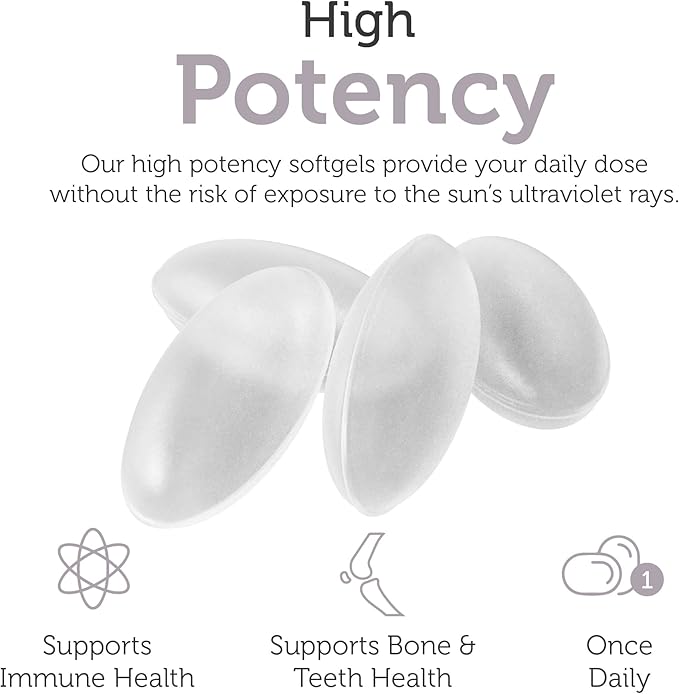 • BONE & TEETH SUPPORT - Vitamin D is an essential vitamin that helps support bone and teeth health in men, women and kids of all ages. Our high potency capsules provide your daily dose without the risk of exposure to the sun's ultraviolet rays.