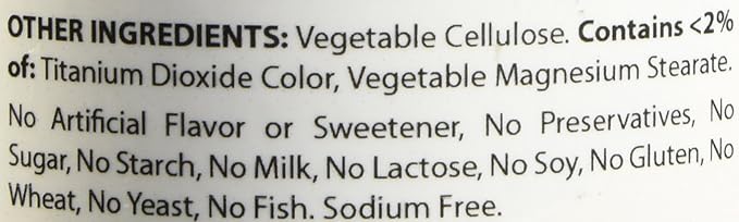 - No Artificial Color, Flavor, or Sweetener, No Preservatives, No Sugar, No Milk, No Corn, No Soy, No Egg, No Lactose, No Gluten, No Wheat, No Yeast, No Fish. Sodium Free.