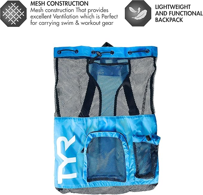 - LARGE CAPACITY: Great for packing swim training equipment, snorkeling gear, beach items, and the pool, the TYR Big Mesh Mummy backpack features an updated design with 20% more capacity for storing all your swimming gear.