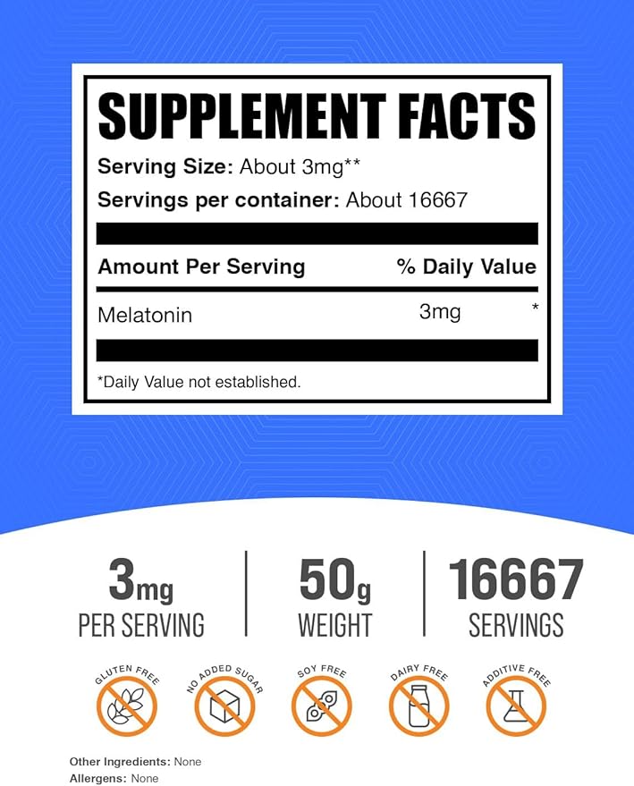 BulkSupplements.com Melatonin Powder - Sleep Supplement, Melatonin for Adults, Melatonin 3 mg - Vegan Melatonin, Pure & Gluten Free, 3mg per Serving, 50g (1.8 oz) (Pack of 1)
