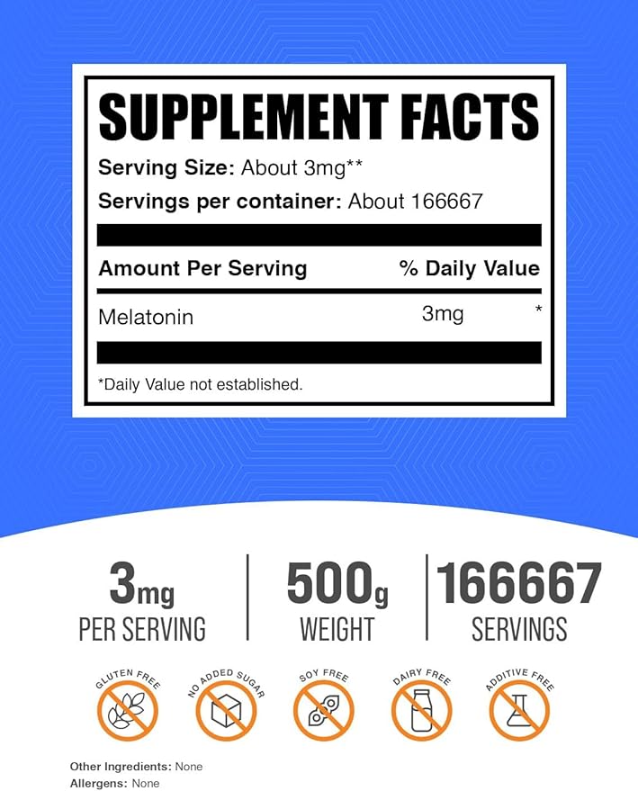 BulkSupplements.com Melatonin Powder - Sleep Supplement, Melatonin for Adults, Melatonin 3 mg - Vegan Melatonin, Pure & Gluten Free, 3mg per Serving, 500g (1.1 lbs) (Pack of 1)