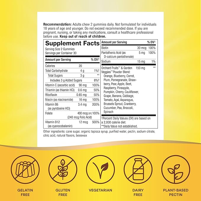 - With 100% Daily Value vitamin C per 2-gummy serving. Also with food-based Orchard Fruits & Garden Veggies powder blend (150 mg per 2-gummy serving).
