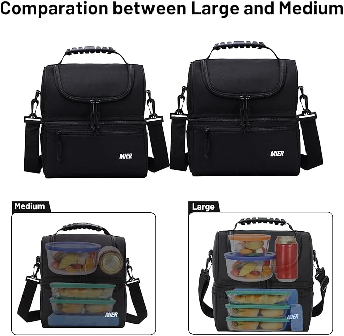 - Insulated Lunch Bag ---- The thick inner insulation with food-grade safe PEVA liner retains coldness or warmth, it can keep food stay cold/warm/fresh for hours, the heat-welded seams guard against leaks; Easy to wipe clean. Top section interior size is 9.45L*7W*5.5H inch, Bottom section interior size is 9.45L*7W*4.7H inch