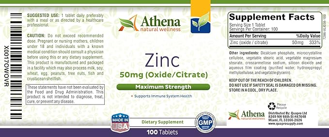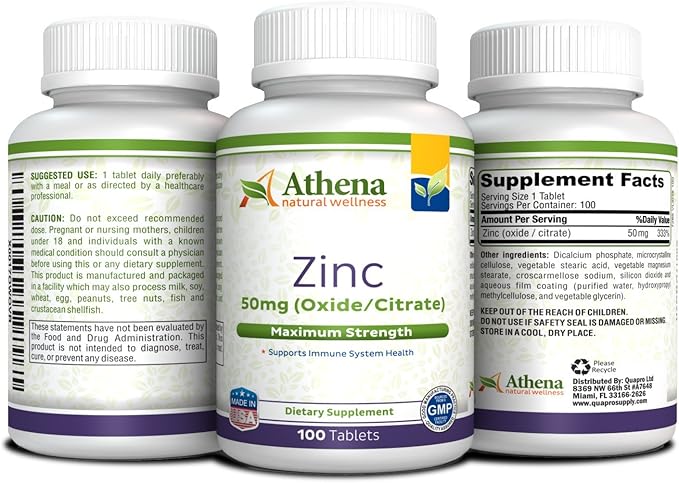 Athena - Zinc Supplement Tablets 50mg - Oxide/Citrate - 100 Coated Tablets