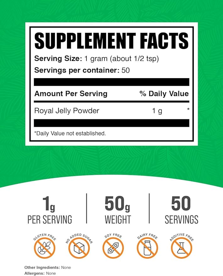 - Intuitive Wellness Support: Feel supported in your wellness journey with our Royal Jelly powder, in Royal Jelly 1000mg, designed to complement your natural lifestyle. Suitable for daily use, our Royal Jelly supplement strives to fit effortlessly into your wellness routine, without any complicated regimens.