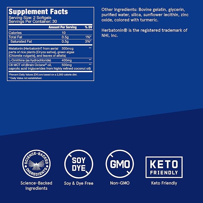- Supports stable energy with Brain Octane C8 MCT Oil and boosts sleep efficiency with 0.3mg of melatonin, just enough to get more restorative sleep